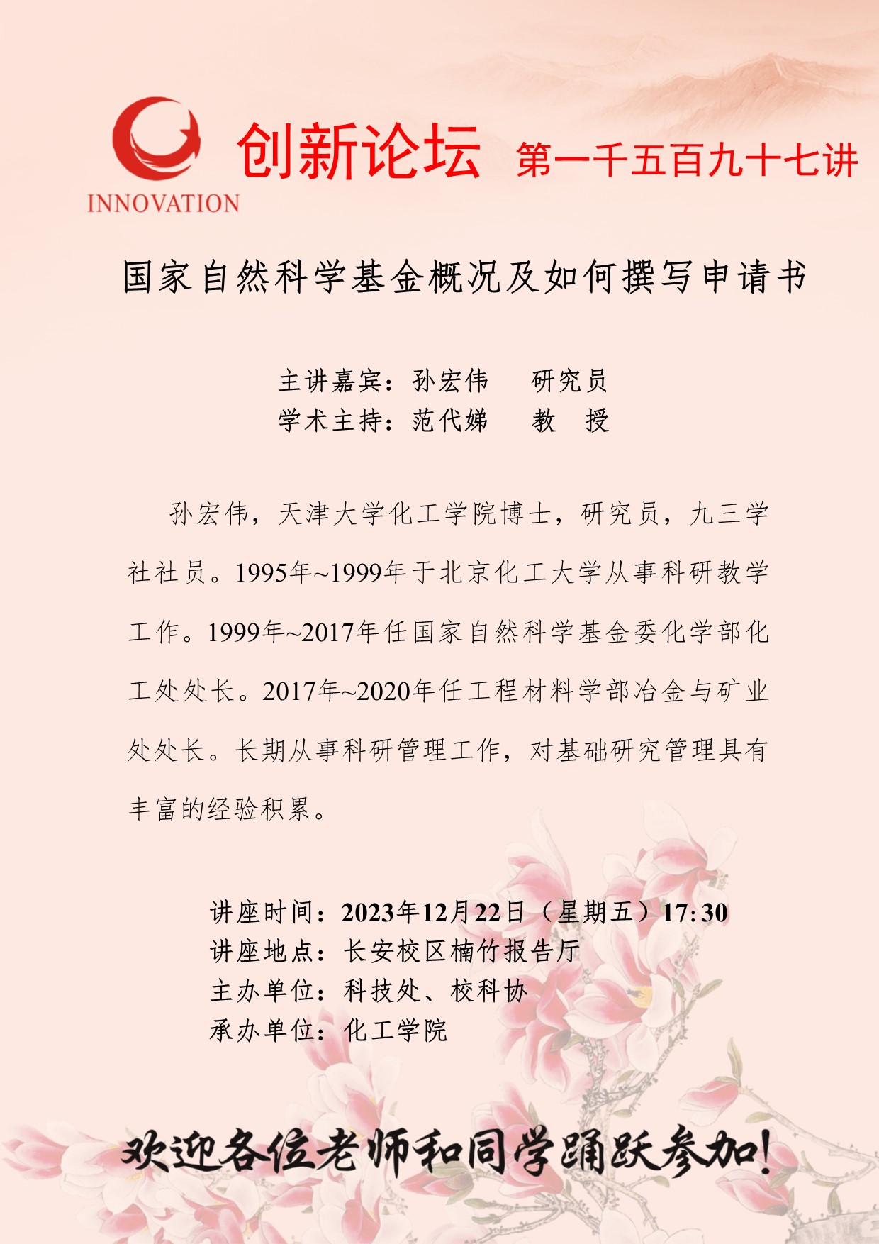 孙宏伟 研究员 乐投平台创新论坛第一千五百九十七讲:国家自然科学基金概况及如何撰写申请书 讲座时间 2023年12月22日(星期五)17:30 讲座地点 长安校区楠竹报告厅 讲座人介绍 孙宏伟 研究员 讲座内容