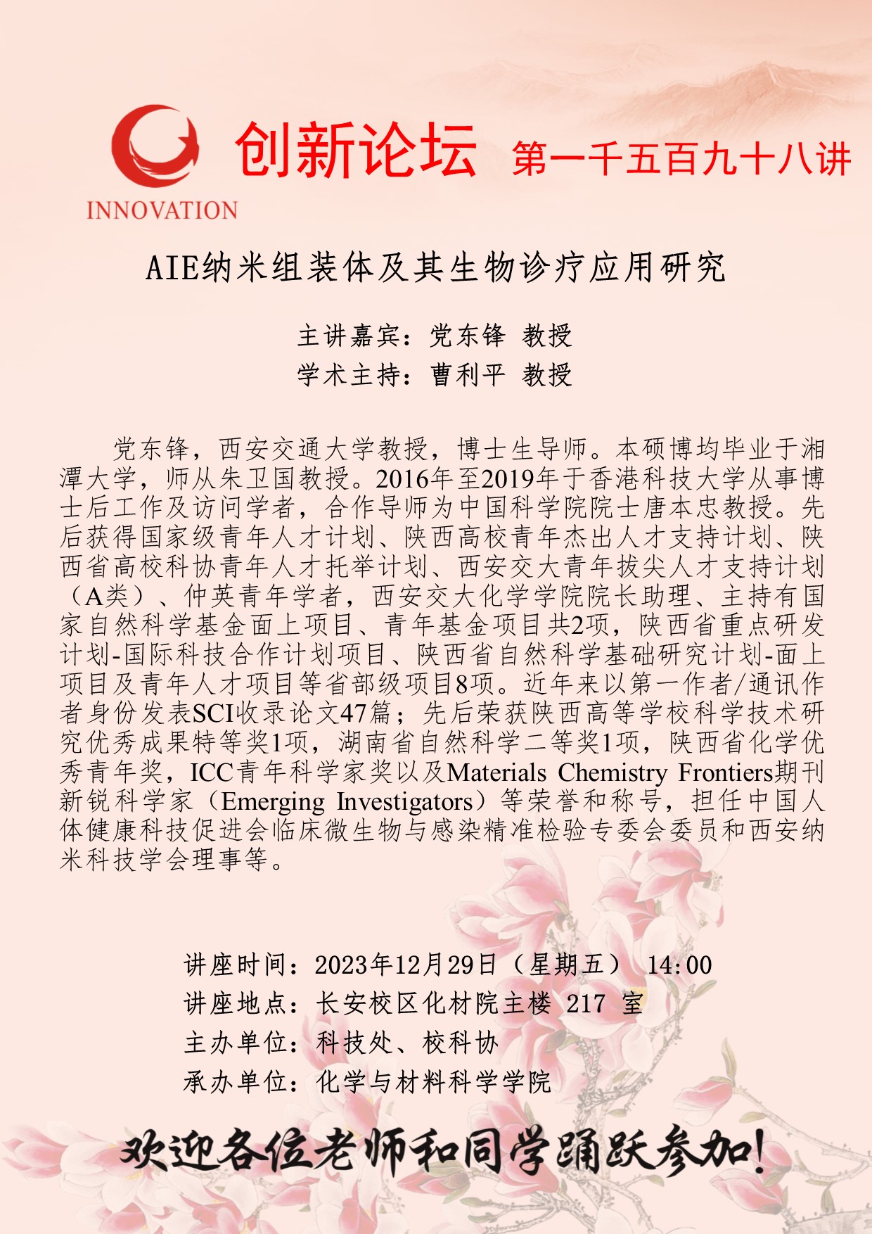 党东锋 教授 乐投平台创新论坛第一千五百九十八讲:AIE纳米组装体及其生物诊疗应用研究 讲座时间 2023年12月29日(星期五) 14:00 讲座地点 长安校区化材院主楼217室 讲座人介绍 党东锋 教授 讲座内容