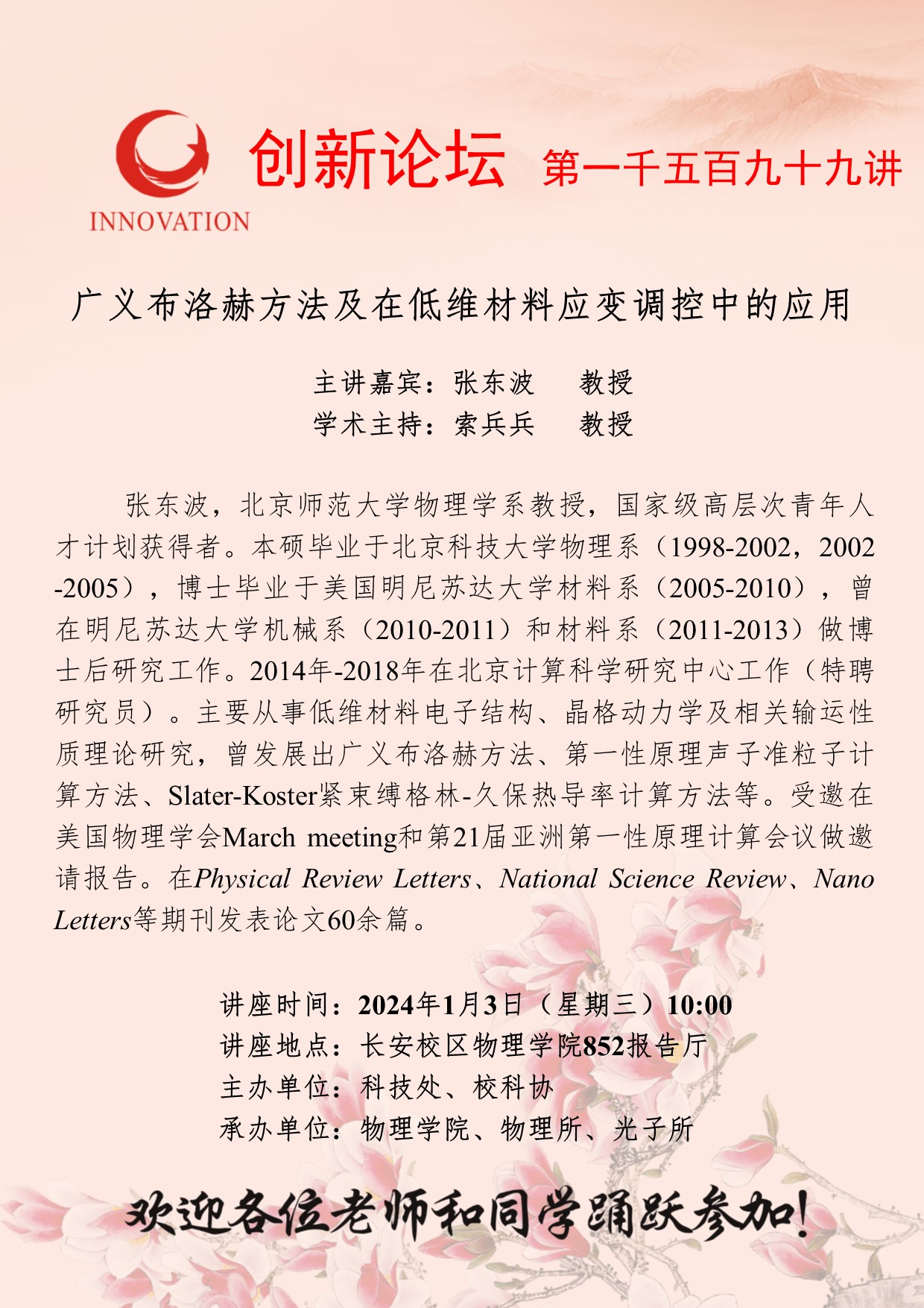 张东波 教授 乐投平台创新论坛第一千五百九十九讲:广义布洛赫方法及在低维材料应变调控中的应用 讲座时间 2024年1月3日(星期三)10:00 讲座地点 长安校区物理学院852报告厅 讲座人介绍 张东波 教授 讲座内容