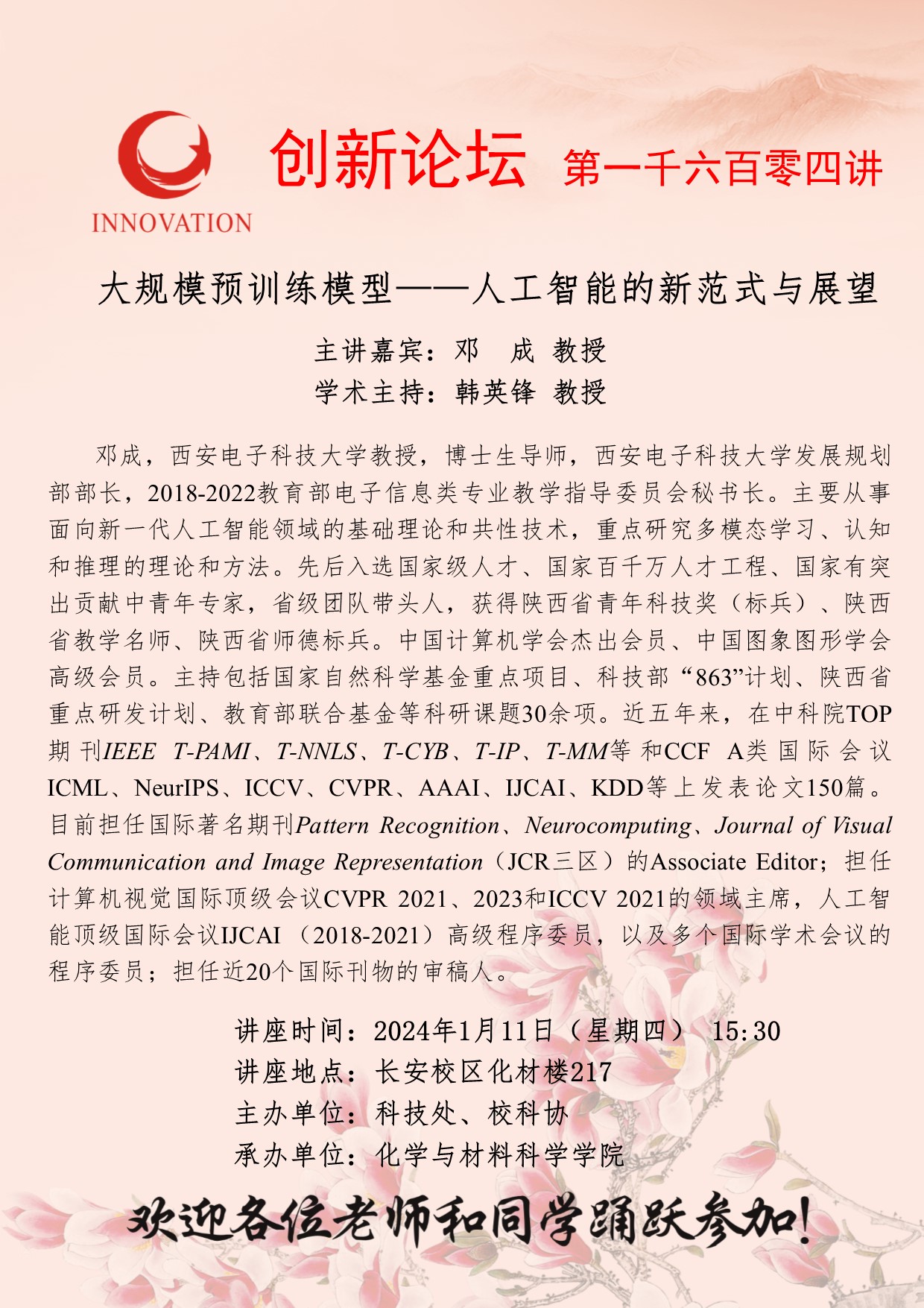 邓成 教授 乐投平台创新论坛第一千六百零四讲:大规模预训练模型——人工智能的新范式与展望 讲座时间 2024年1月11日(星期四) 15:30 讲座地点 长安校区化材楼217 讲座人介绍 邓成 教授 讲座内容
