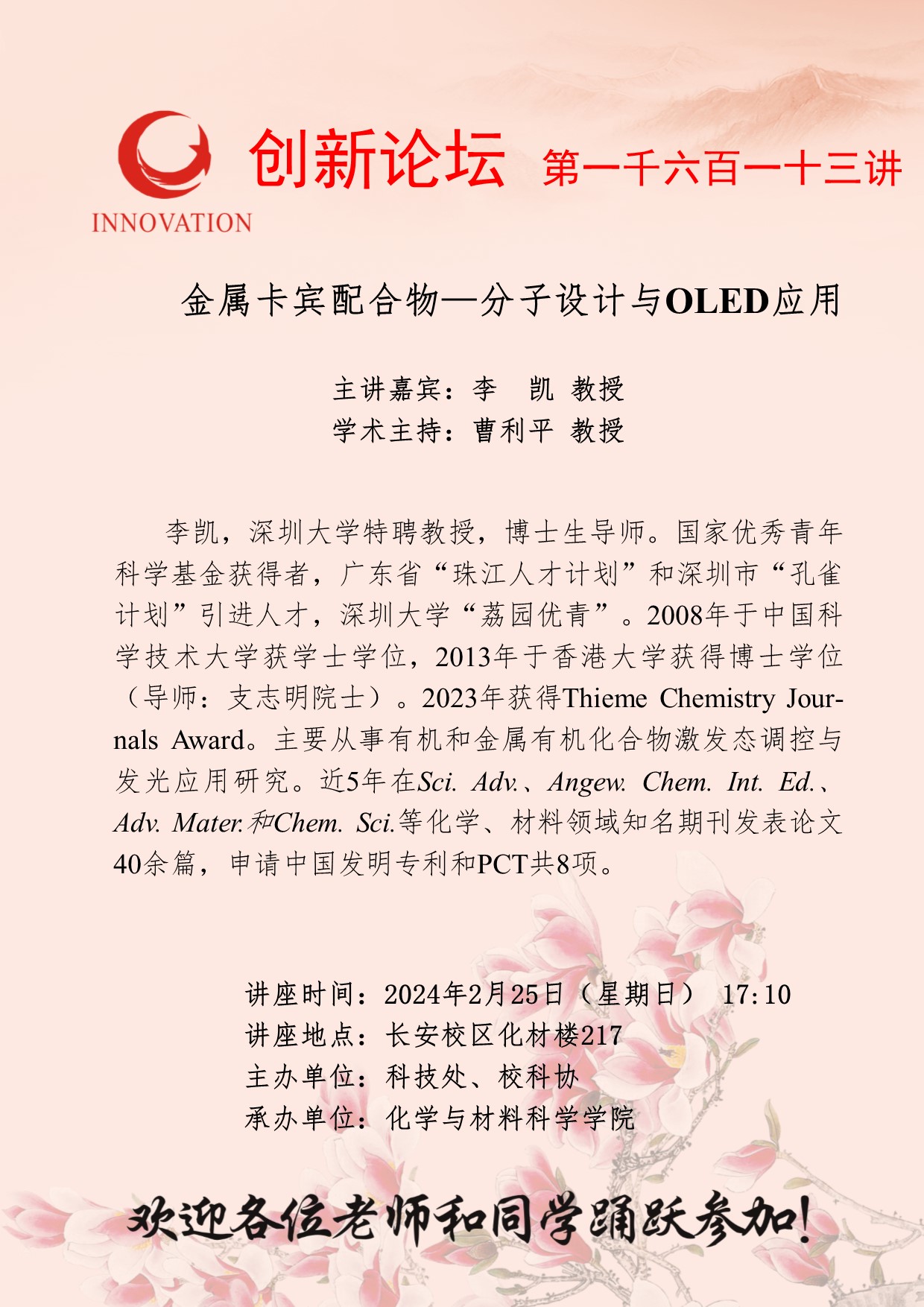 李凯 教授 乐投平台创新论坛第一千六百一十三讲:金属卡宾配合物—分子设计与OLED应用 讲座时间 2024年2月25日(星期日) 17:10 讲座地点 长安校区化材楼217 讲座人介绍 李凯 教授 讲座内容
