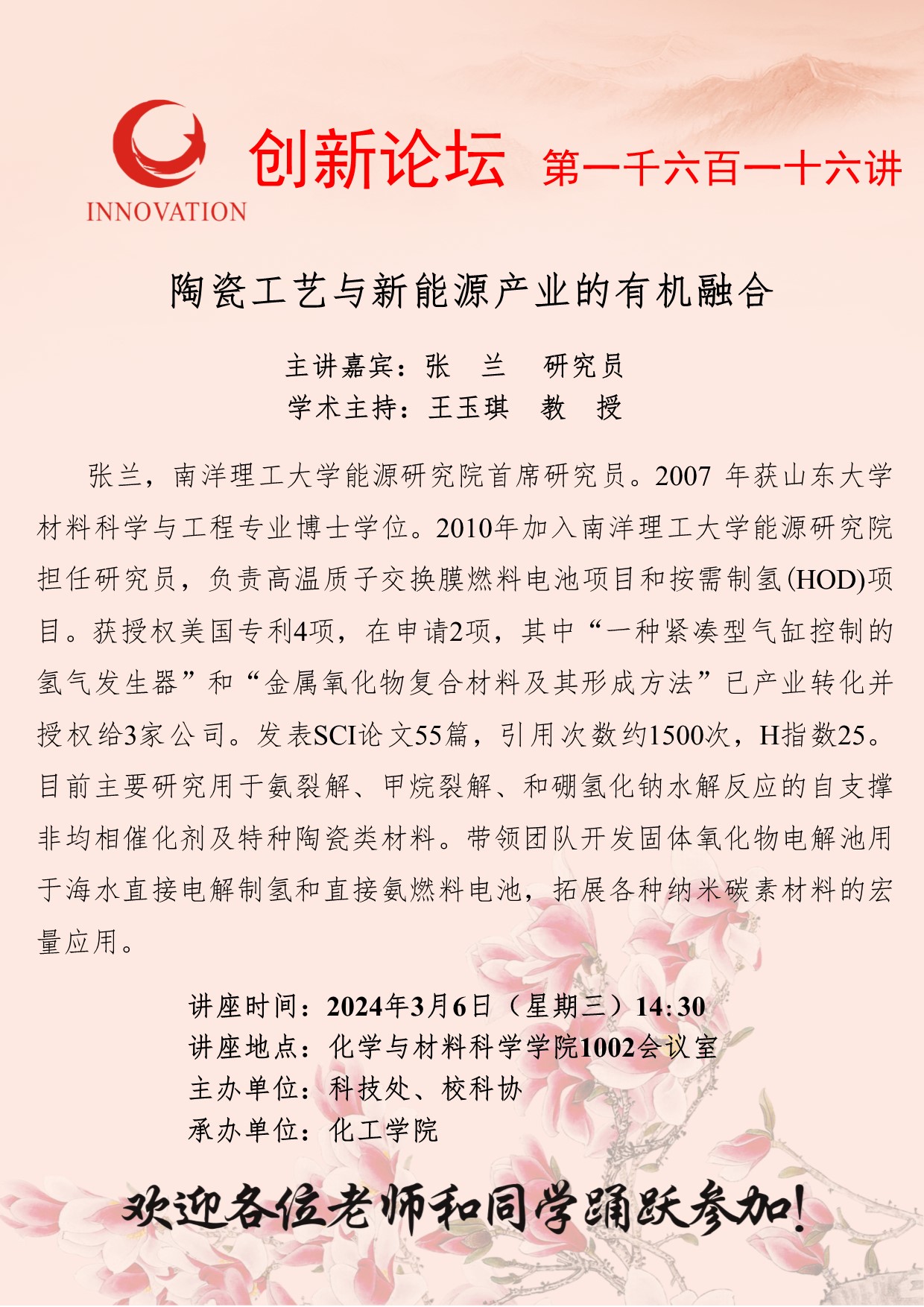 张兰 研究员 乐投平台创新论坛第一千六百一十六讲:陶瓷工艺与新能源产业的有机融合 讲座时间 2024年3月6日(星期三)14:30 讲座地点 化学与材料科学学院1002会议室 讲座人介绍 张兰 研究员 讲座内容