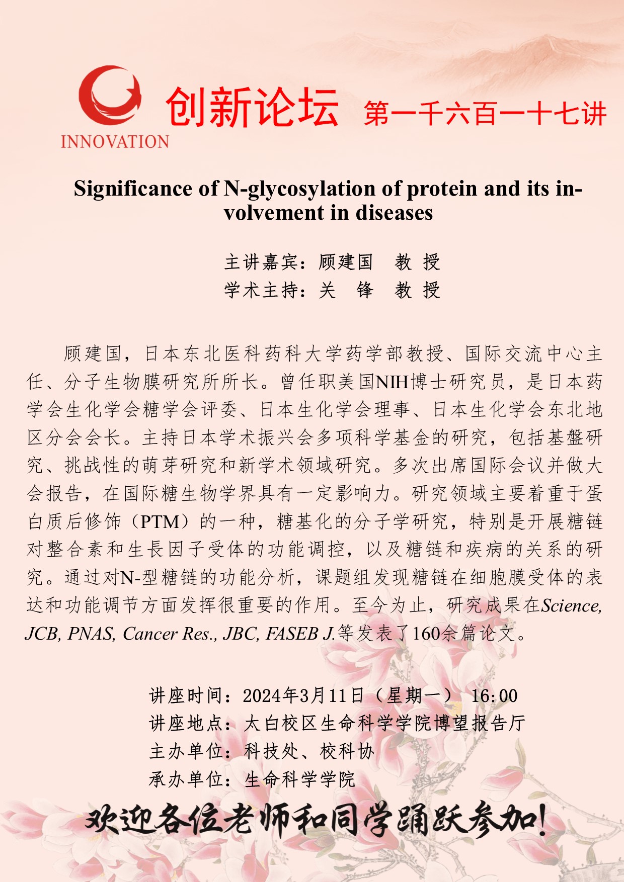 顾建国 教授 乐投平台创新论坛第一千六百一十七讲:Significance of N-glycosylation of protein and its involvement in diseases 讲座时间 2024年3月11日(星期一) 16:00 讲座地点 太白校区生命科学学院博望报告厅 讲座人介绍 顾建国 教授 讲座内容