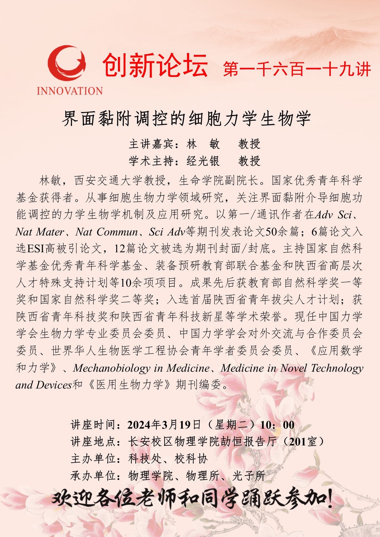 林敏 教授 乐投平台创新论坛第一千六百一十九讲:界面黏附调控的细胞力学生物学 讲座时间 2024年3月19日(星期二)10:00 讲座地点 长安校区物理学院劼恒报告厅(201室) 讲座人介绍 林敏 教授 讲座内容