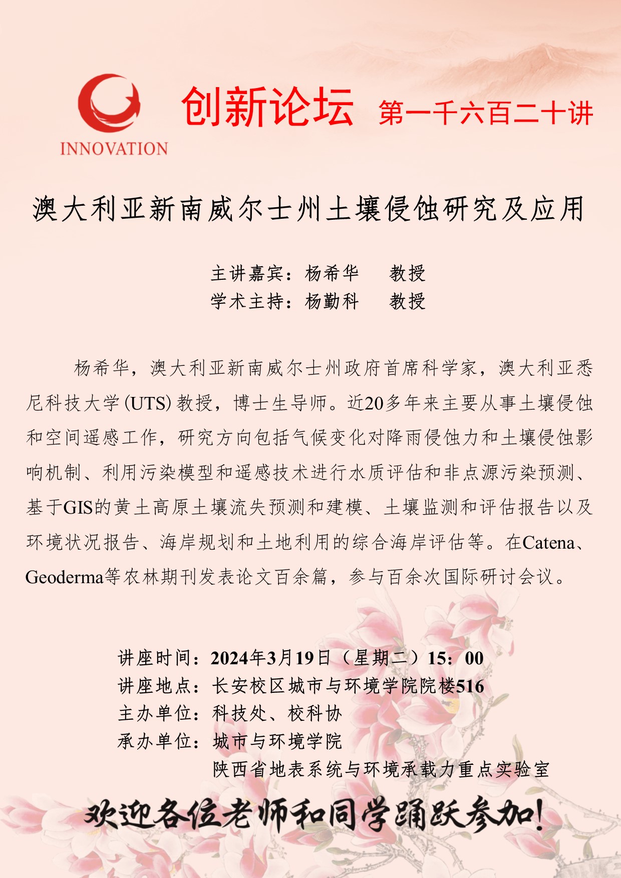 杨希华 教授 乐投平台创新论坛第一千六百二十讲:澳大利亚新南威尔士州土壤侵蚀研究及应用 讲座时间 2024年3月19日(星期二)15:00 讲座地点 长安校区城市与环境学院院楼516 讲座人介绍 杨希华 教授 讲座内容