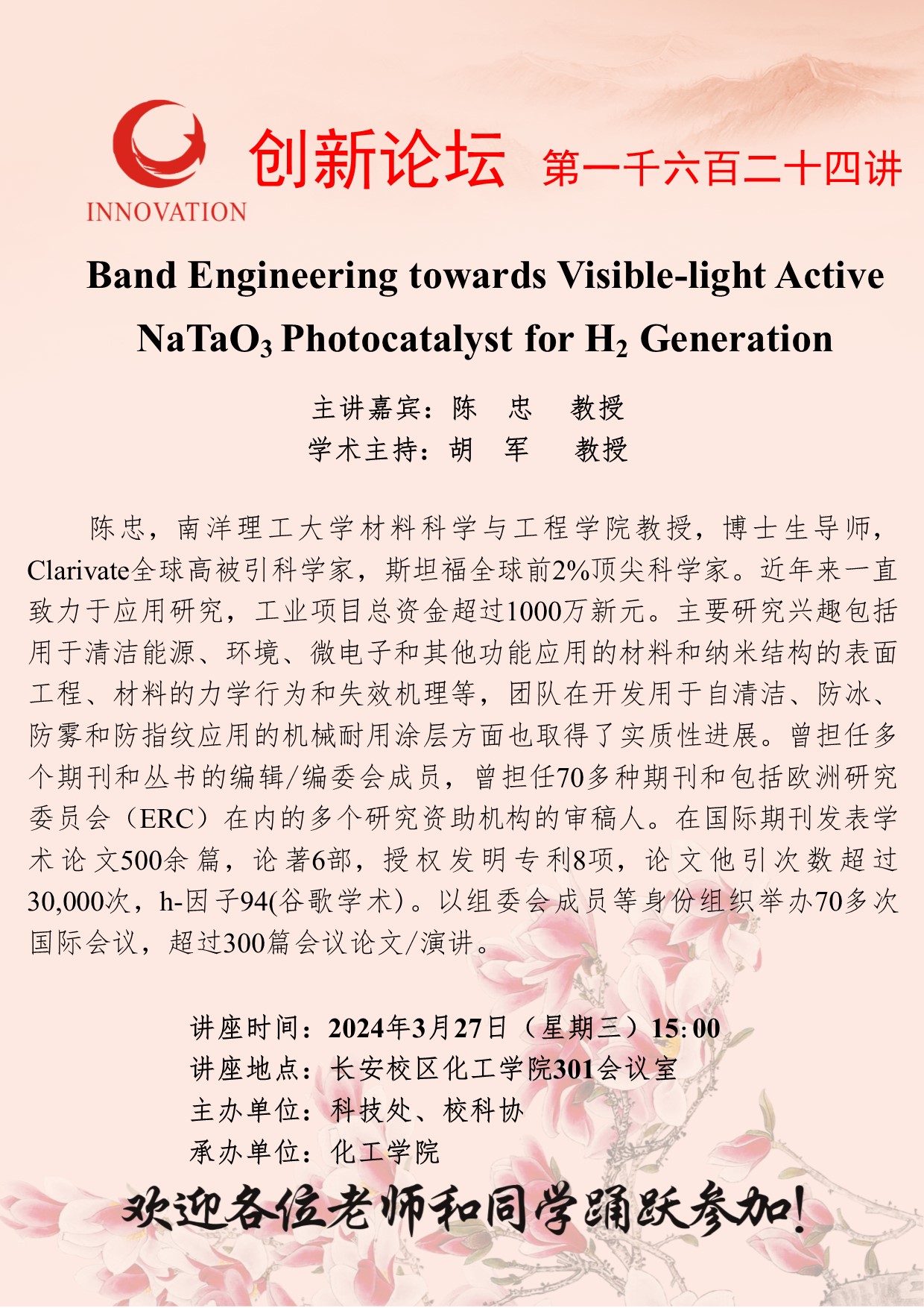 陈忠 教授 乐投平台创新论坛第一千六百二十四讲:Band Engineering towards Visible-light Active NaTaO3 Photocatalyst for H2 Generation 讲座时间 2024年3月27日(星期三)15:00 讲座地点 长安校区化工学院301会议室 讲座人介绍 陈忠 教授 讲座内容