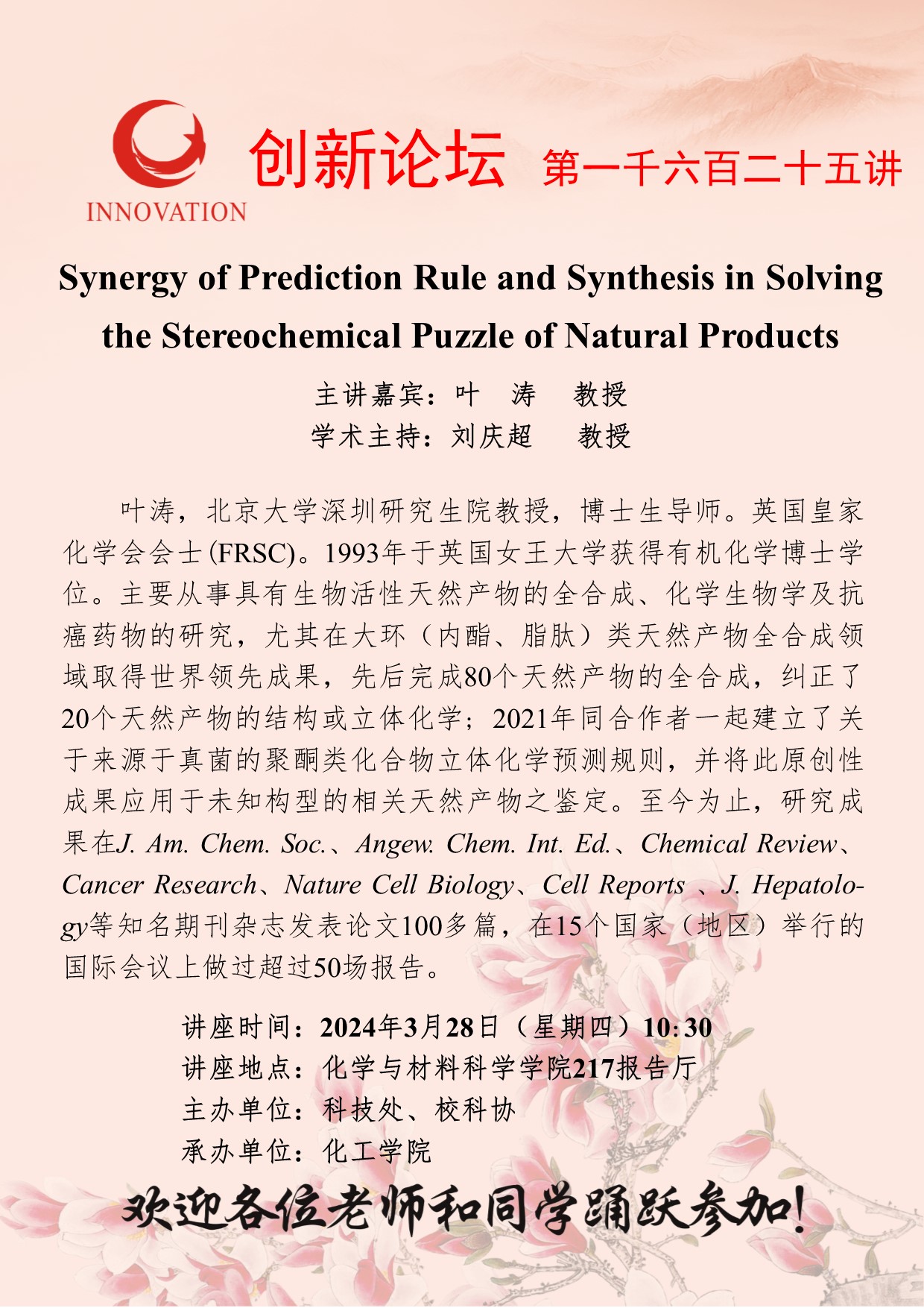 叶涛 教授 乐投平台创新论坛第一千六百二十五讲:Synergy of Prediction Rule and Synthesis in Solving the Stereochemical Puzzle of Natural Products 讲座时间 2024年3月28日(星期四)10:30 讲座地点 化学与材料科学学院217报告厅 讲座人介绍 叶涛 教授 讲座内容