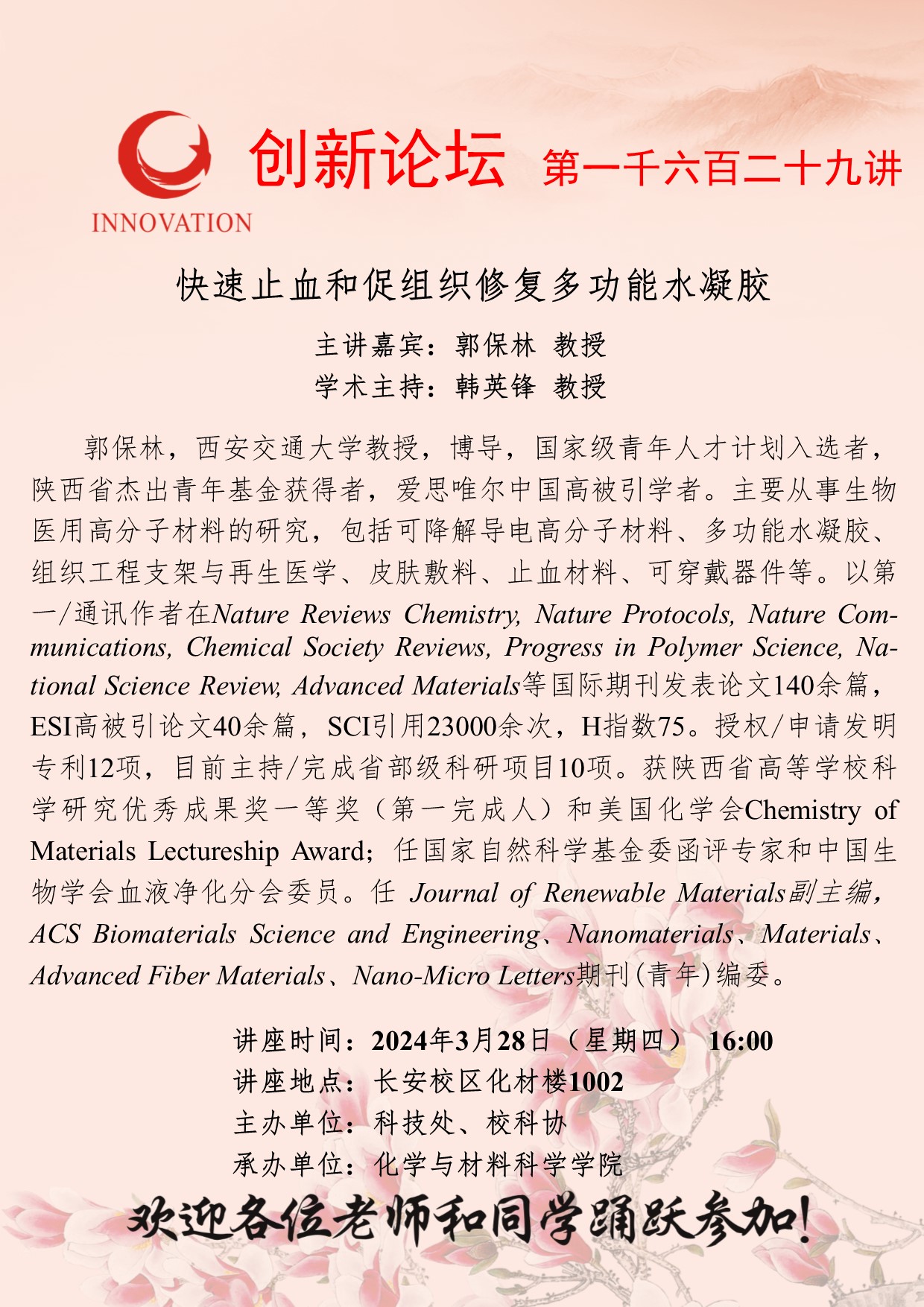 郭保林 教授 乐投平台创新论坛第一千六百二十九讲:快速止血和促组织修复多功能水凝胶 讲座时间 2024年3月28日(星期四) 16:00 讲座地点 长安校区化材楼1002 讲座人介绍 郭保林 教授 讲座内容