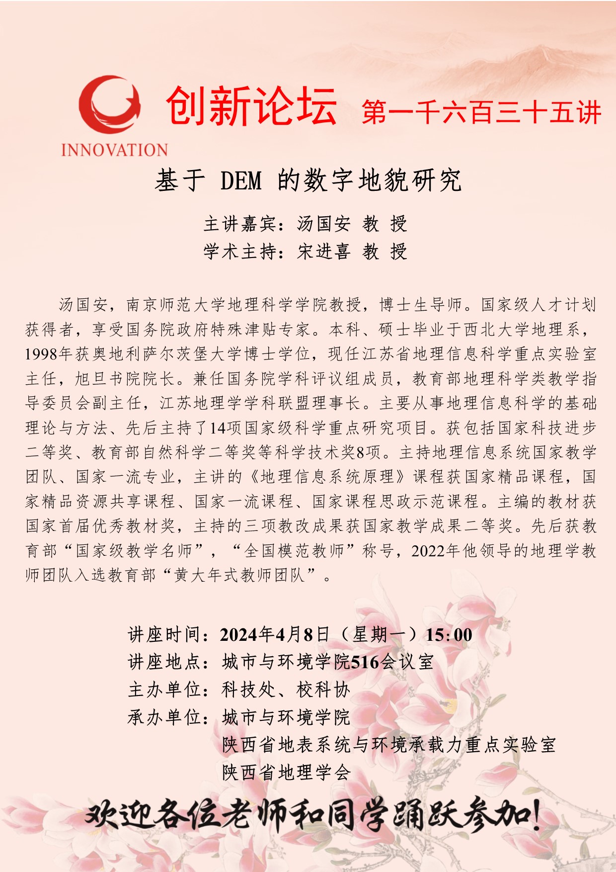 汤国安 教授 乐投平台创新论坛第一千六百三十五讲:基于 DEM 的数字地貌研究 讲座时间 2024年4月8日(星期一)15:00 讲座地点 城市与环境学院516会议室 讲座人介绍 汤国安 教授 讲座内容