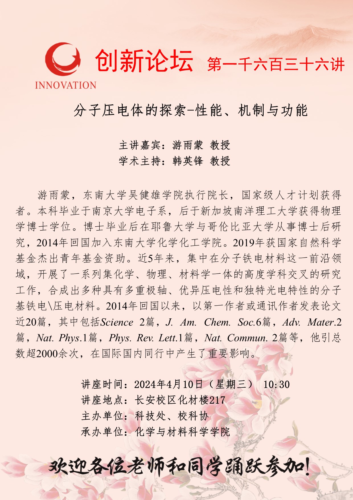 游雨蒙 教授 乐投平台创新论坛第一千六百三十六讲:分子压电体的探索-性能、机制与功能 讲座时间 2024年4月10日(星期三) 10:30 讲座地点 长安校区化材楼217 讲座人介绍 游雨蒙 教授 讲座内容