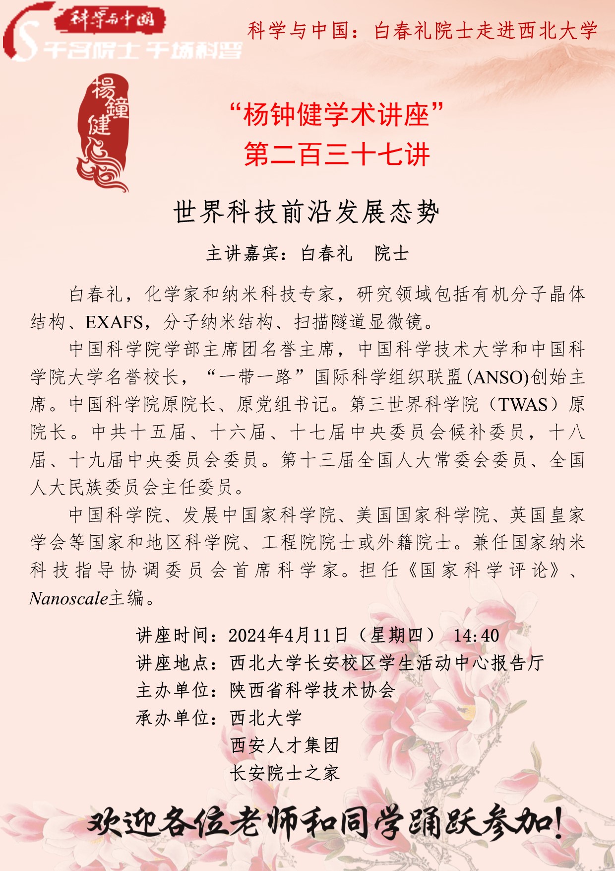 白春礼 院士 “杨钟健学术讲座”第二百三十七讲:世界科技前沿发展态势 讲座时间 2024年4月11日(星期四) 14:40 讲座地点 乐投平台长安校区学生活动中心报告厅 讲座人介绍 白春礼 院士 讲座内容