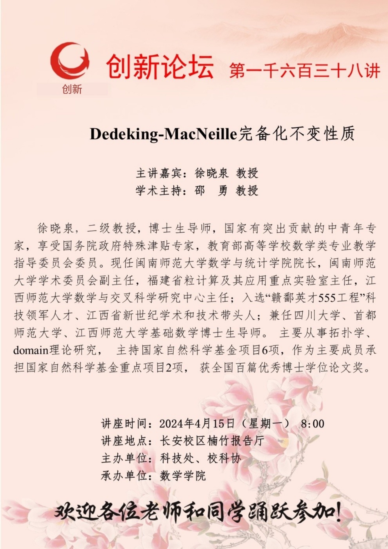 徐晓泉 教授 乐投平台创新论坛第一千六百三十八讲:Dedeking-MacNeille完备化不变性质 讲座时间 2024年4月15日(星期一) 8:00 讲座地点 长安校区楠竹报告厅 讲座人介绍 徐晓泉 教授 讲座内容