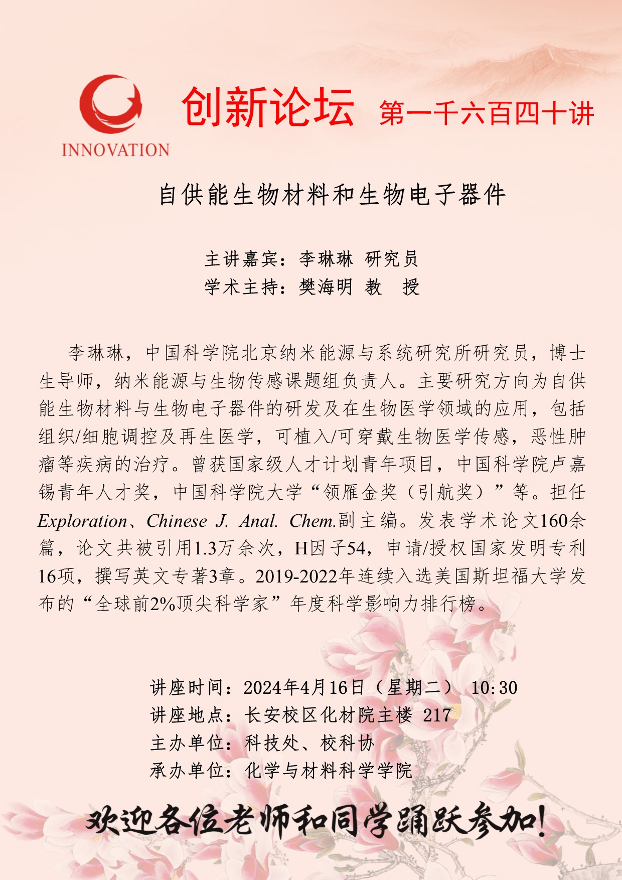 李琳琳 研究员 乐投平台创新论坛第一千六百四十讲:自供能生物材料和生物电子器件 讲座时间 2024年4月16日(星期二) 10:30 讲座地点 长安校区化材院主楼 217 讲座人介绍 李琳琳 研究员 讲座内容