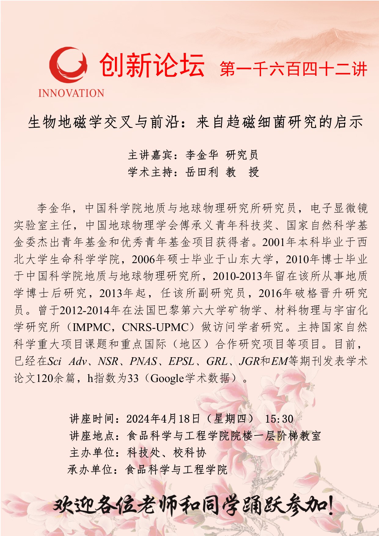 李金华 研究员 乐投平台创新论坛第一千六百四十二讲:生物地磁学交叉与前沿:来自趋磁细菌研究的启示 讲座时间 2024年4月18日(星期四) 15:30 讲座地点 食品科学与工程学院院楼一层阶梯教室 讲座人介绍 李金华 研究员 讲座内容