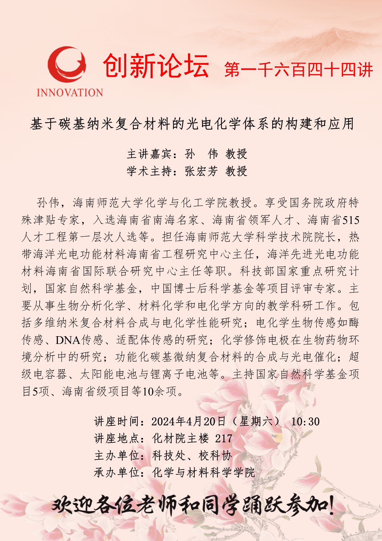 孙伟 教授 乐投平台创新论坛第一千六百四十四讲:基于碳基纳米复合材料的光电化学体系的构建和应用 讲座时间 2024年4月20日(星期六) 10:30 讲座地点 化材院主楼 217 讲座人介绍 孙伟 教授 讲座内容