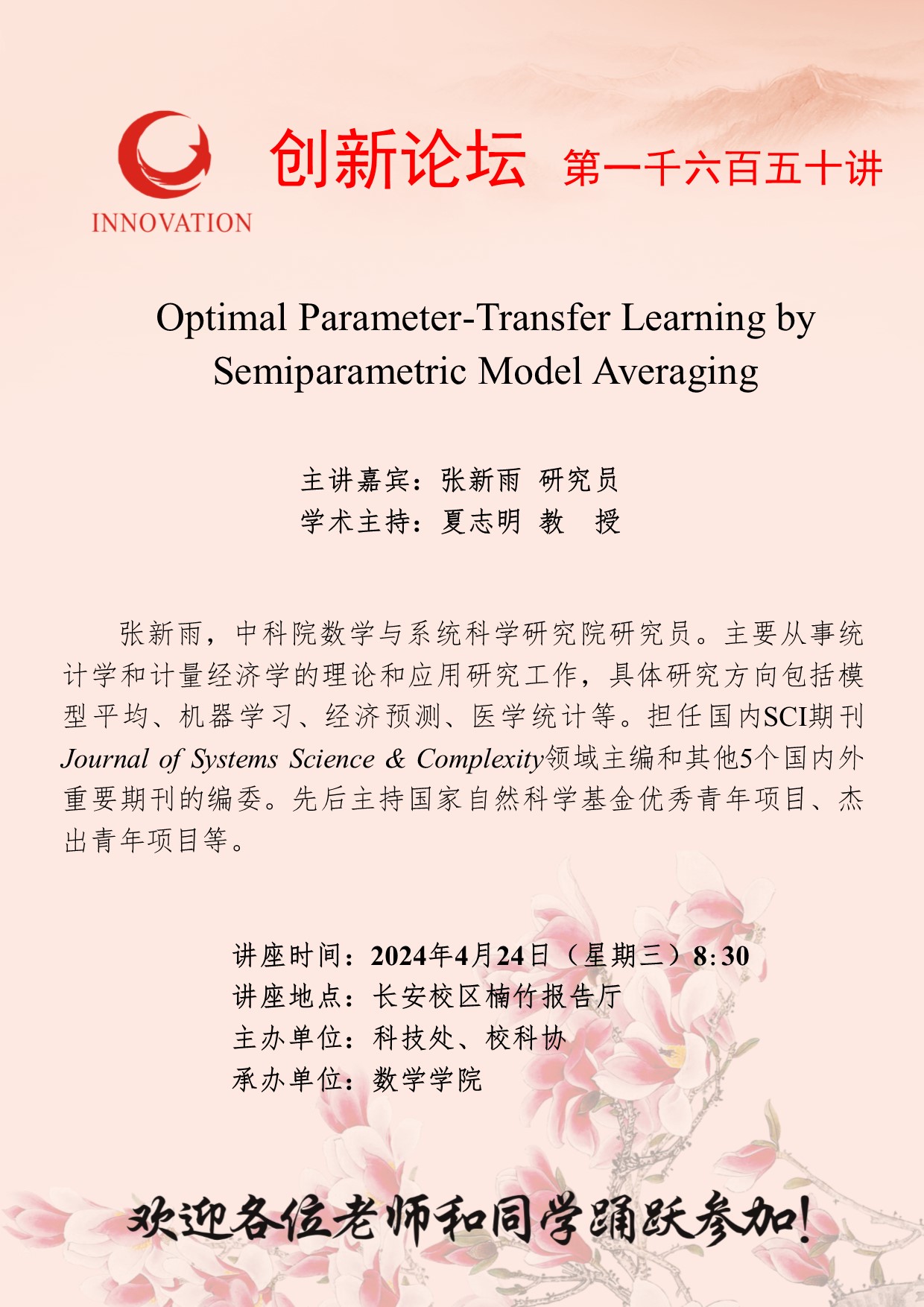 张新雨 研究员 乐投平台创新论坛第一千六百五十讲:Optimal Parameter-Transfer Learning by Semiparametric Model Averaging 讲座时间 2024年4月24日(星期三)8:30 讲座地点 长安校区楠竹报告厅 讲座人介绍 张新雨 研究员 讲座内容