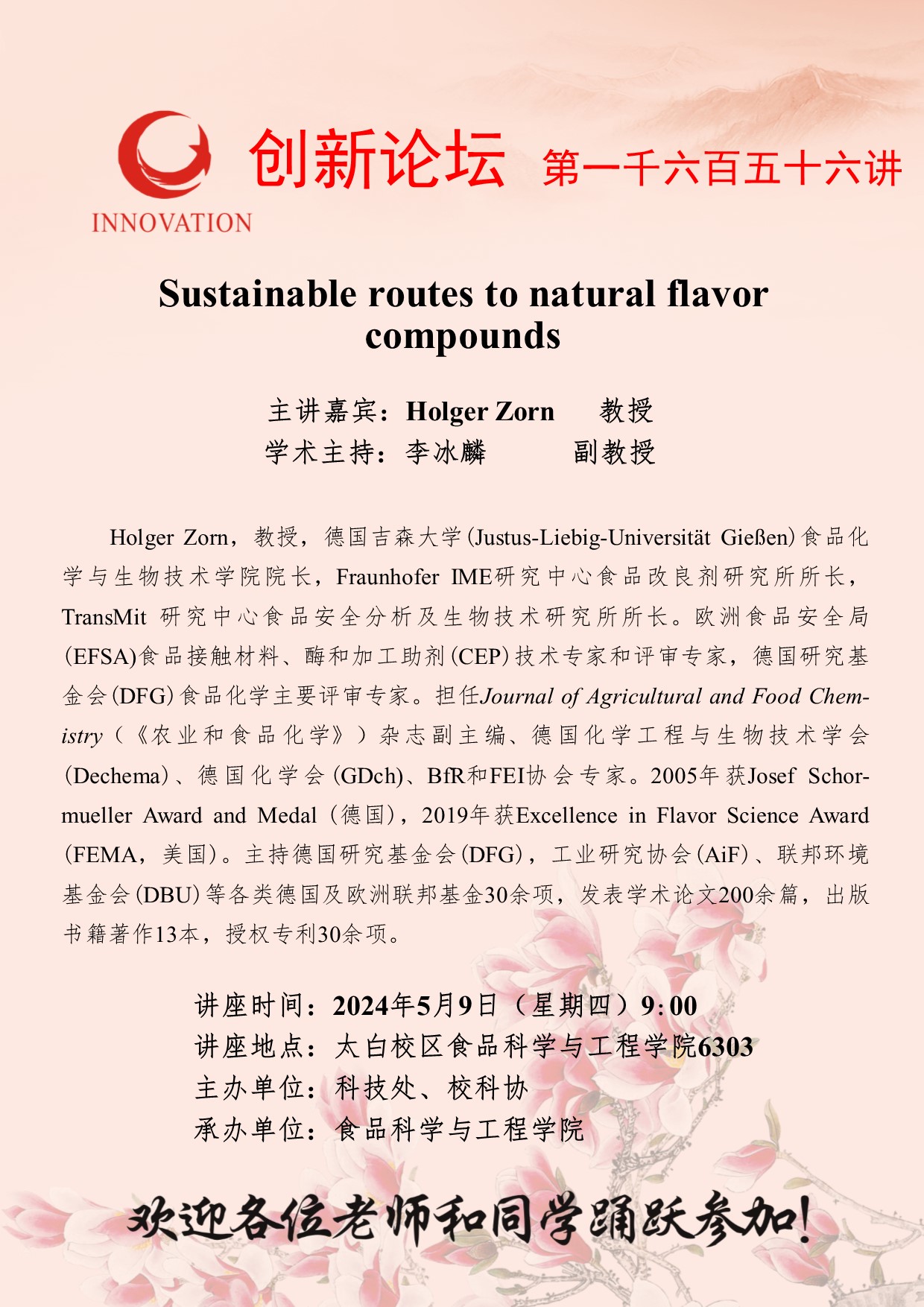 Holger Zorn 教授 乐投平台创新论坛第一千六百五十六讲:Sustainable routes to natural flavor compounds 讲座时间 2024年5月9日(星期四)9:00 讲座地点 太白校区食品科学与工程学院6303 讲座人介绍 Holger Zorn 教授 讲座内容