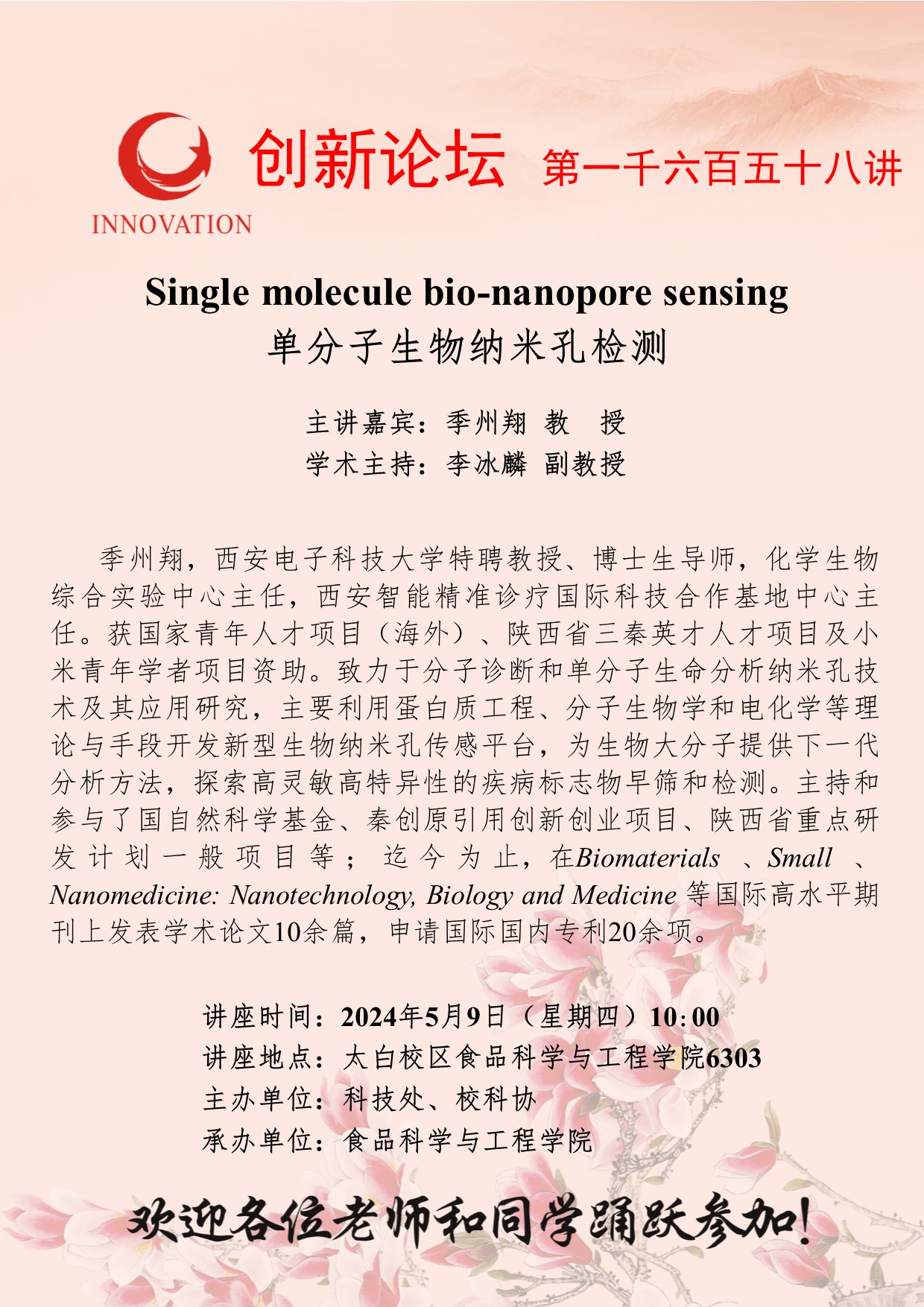 季州翔 教授 乐投平台创新论坛第一千六百五十八讲:Single molecule bio-nanopore sensing 讲座时间 2024年5月9日(星期四)10:00 讲座地点 太白校区食品科学与工程学院6303 讲座人介绍 季州翔 教授 讲座内容