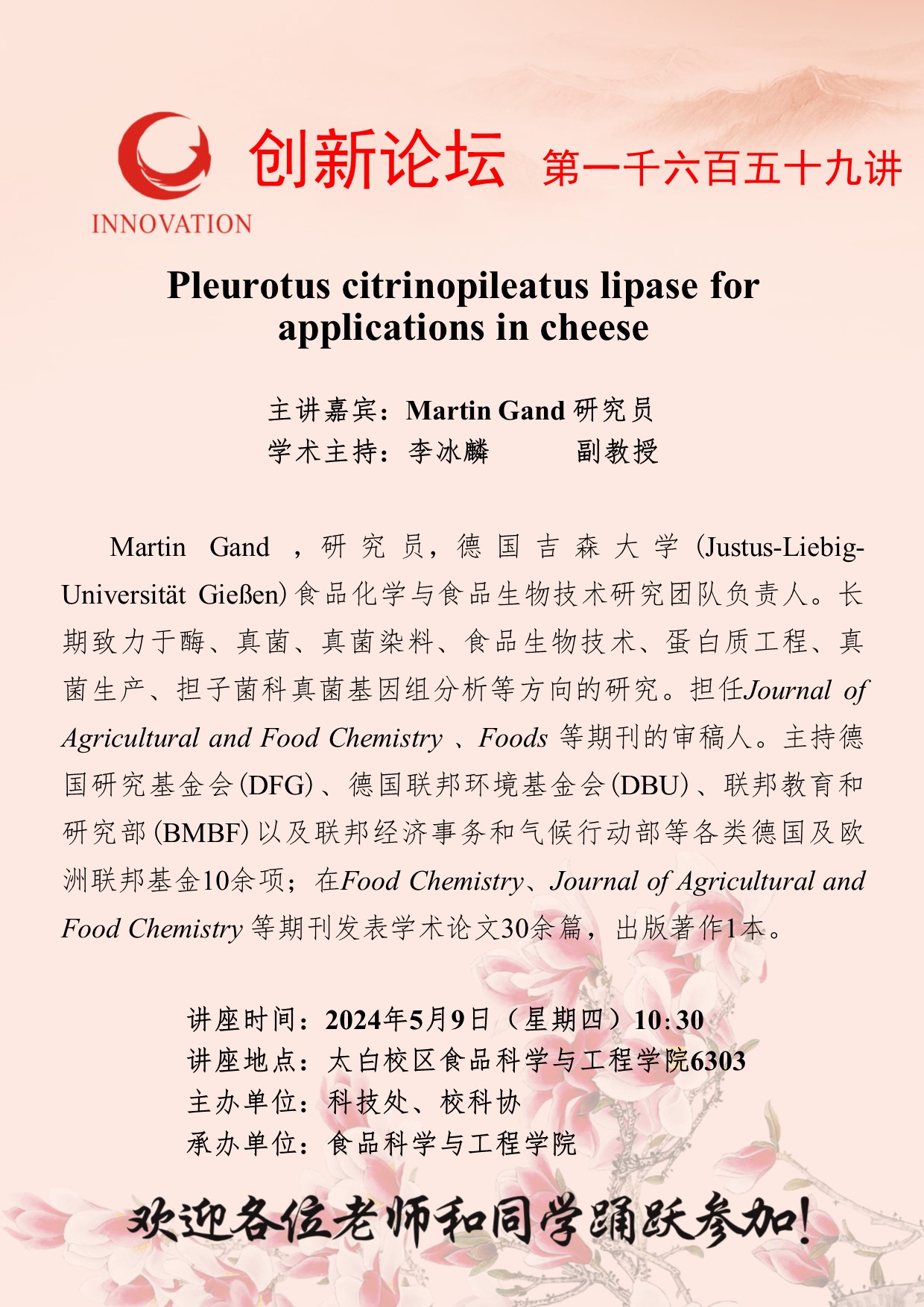 Martin Gand 研究员 乐投平台创新论坛第一千六百五十九讲:Pleurotus citrinopileatus lipase for applications in cheese 讲座时间 2024年5月9日(星期四)10:30 讲座地点 太白校区食品科学与工程学院6303 讲座人介绍 Martin Gand 研究员 讲座内容