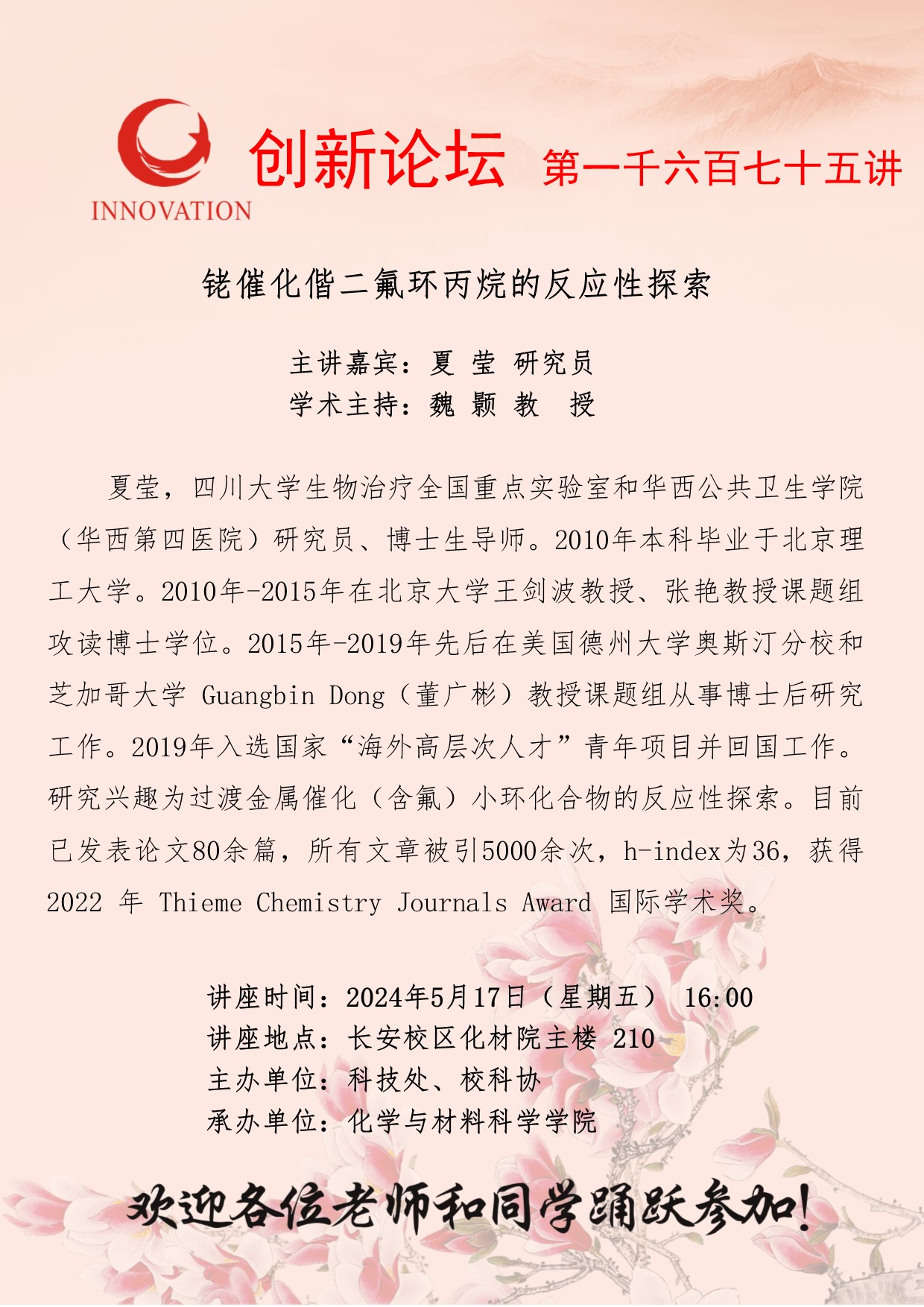 夏莹 研究员 乐投平台创新论坛第一千六百七十五讲:铑催化偕二氟环丙烷的反应性探索 讲座时间 2024年5月17日(星期五) 16:00 讲座地点 长安校区化材院主楼 210 讲座人介绍 夏莹 研究员 讲座内容