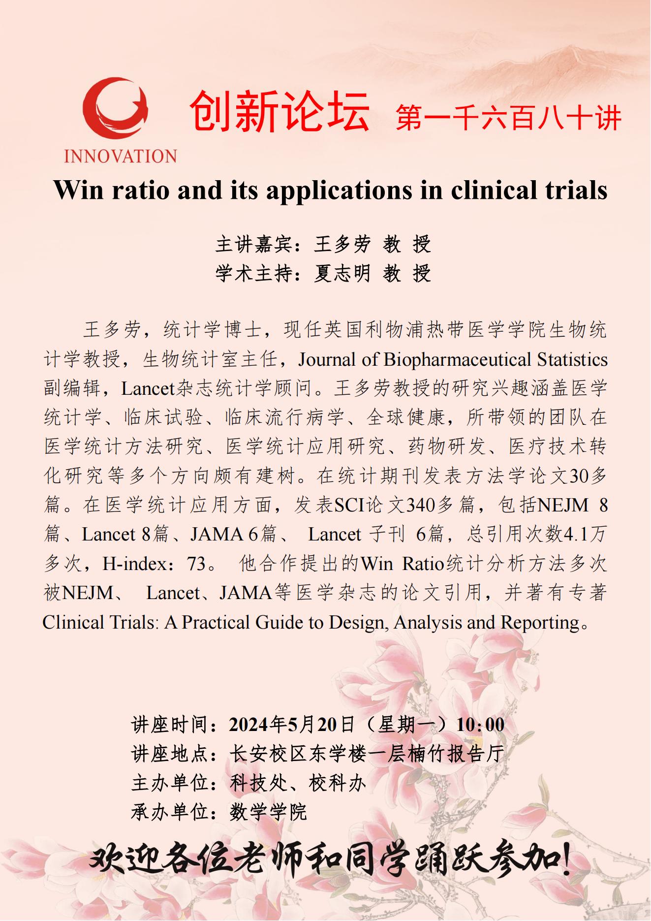 王多劳 教授 乐投平台创新论坛第一千六百八十讲:Win ratio and its applications in clinical trials 讲座时间 2024年5月20日(星期一) 10:00 讲座地点 长安校区东学楼一层楠竹报告厅 讲座人介绍 王多劳 教授 讲座内容