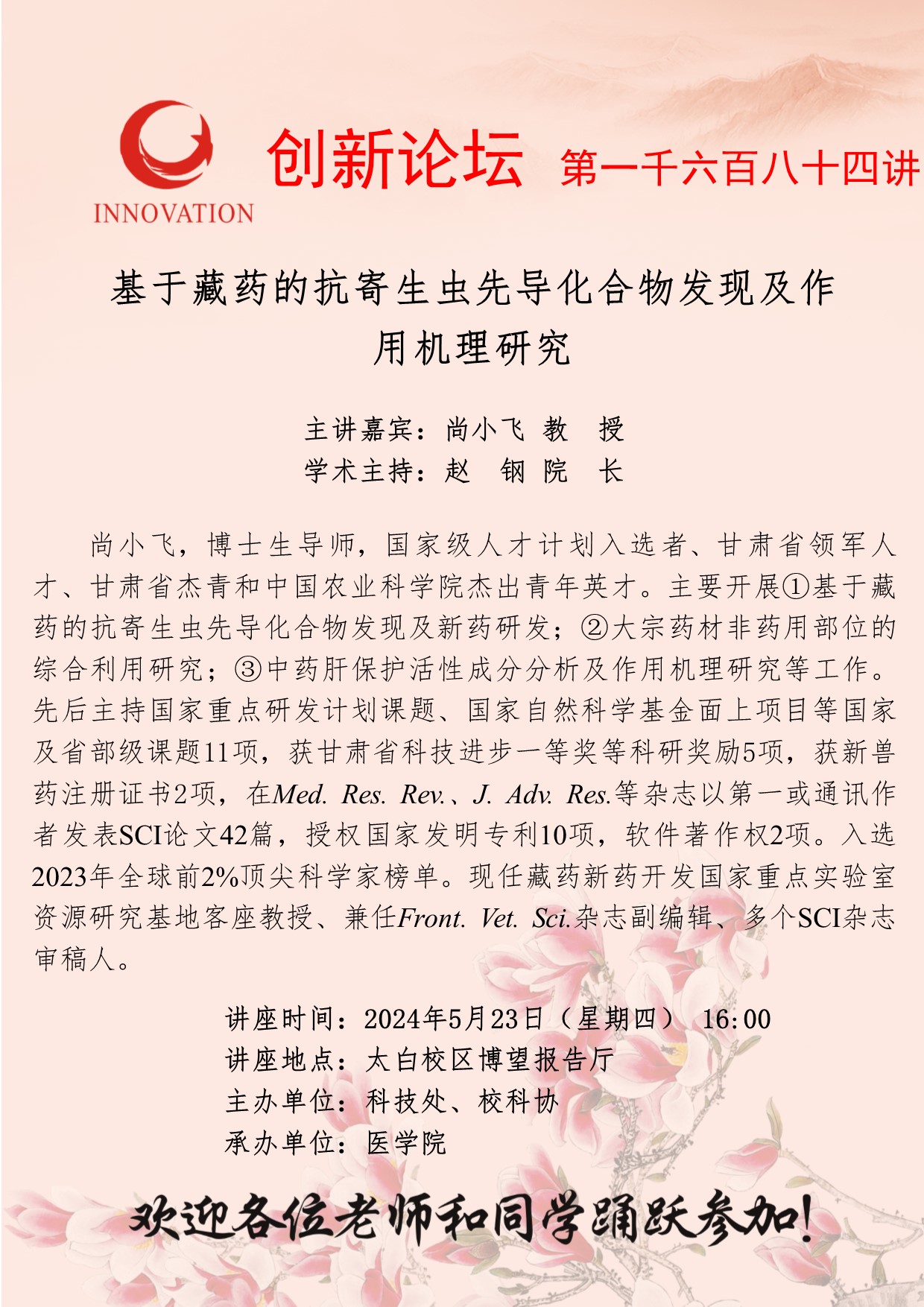 尚小飞 教授 乐投平台创新论坛第一千六百八十四讲:基于藏药的抗寄生虫先导化合物发现及作用机理研究 讲座时间 2024年5月23日(星期四) 16:00 讲座地点 太白校区博望报告厅 讲座人介绍 尚小飞 教授 讲座内容