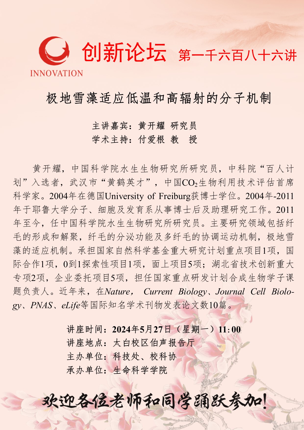 黄开耀 研究员 乐投平台创新论坛第一千六百八十六讲:极地雪藻适应低温和高辐射的分子机制 讲座时间 2024年5月27日(星期一)11:00 讲座地点 太白校区伯声报告厅 讲座人介绍 黄开耀 研究员 讲座内容