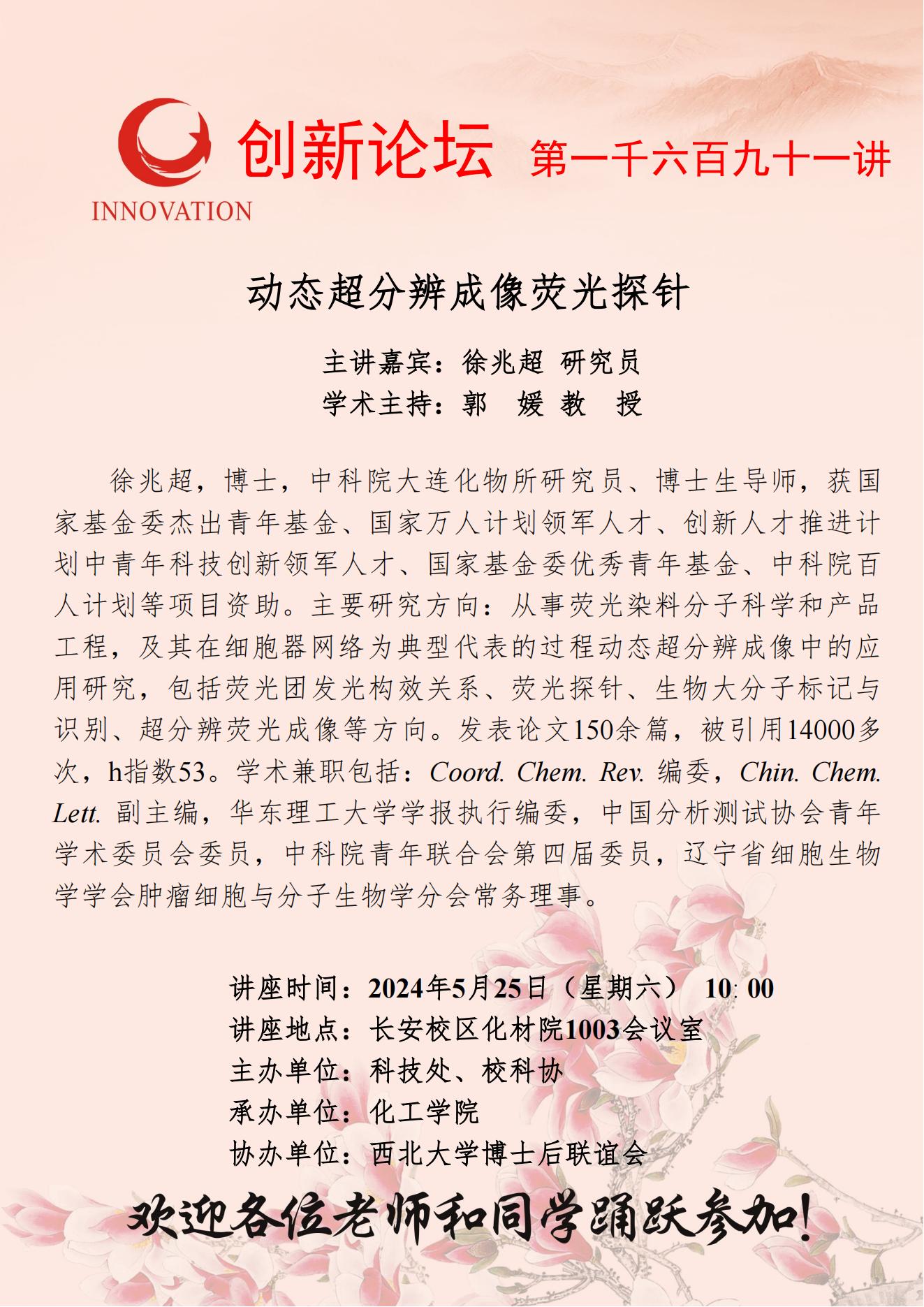 徐兆超 研究员 乐投平台创新论坛第一千六百九十一讲:动态超分辨成像荧光探针 讲座时间 2024年5月25日(星期六) 10: 00 讲座地点 长安校区化材院1003会议室 讲座人介绍 徐兆超 研究员 讲座内容