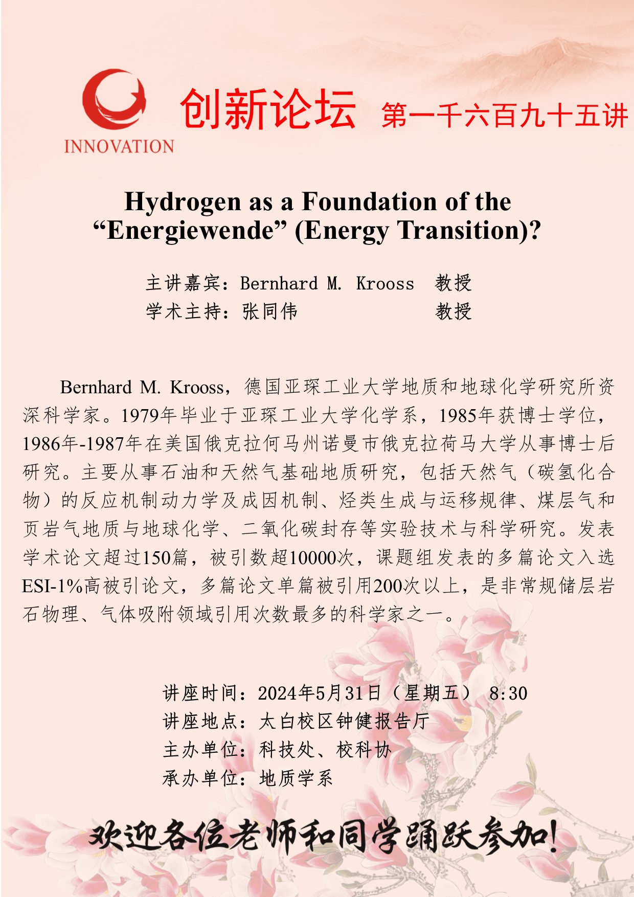 Bernhard M. Krooss 教授 乐投平台创新论坛第一千六百九十五讲:Hydrogen as a Foundation of the “Energiewende” (Energy Transition)? 讲座时间 2024年5月31日(星期五) 8:30 讲座地点 太白校区钟健报告厅 讲座人介绍 Bernhard M. Krooss 教授 讲座内容