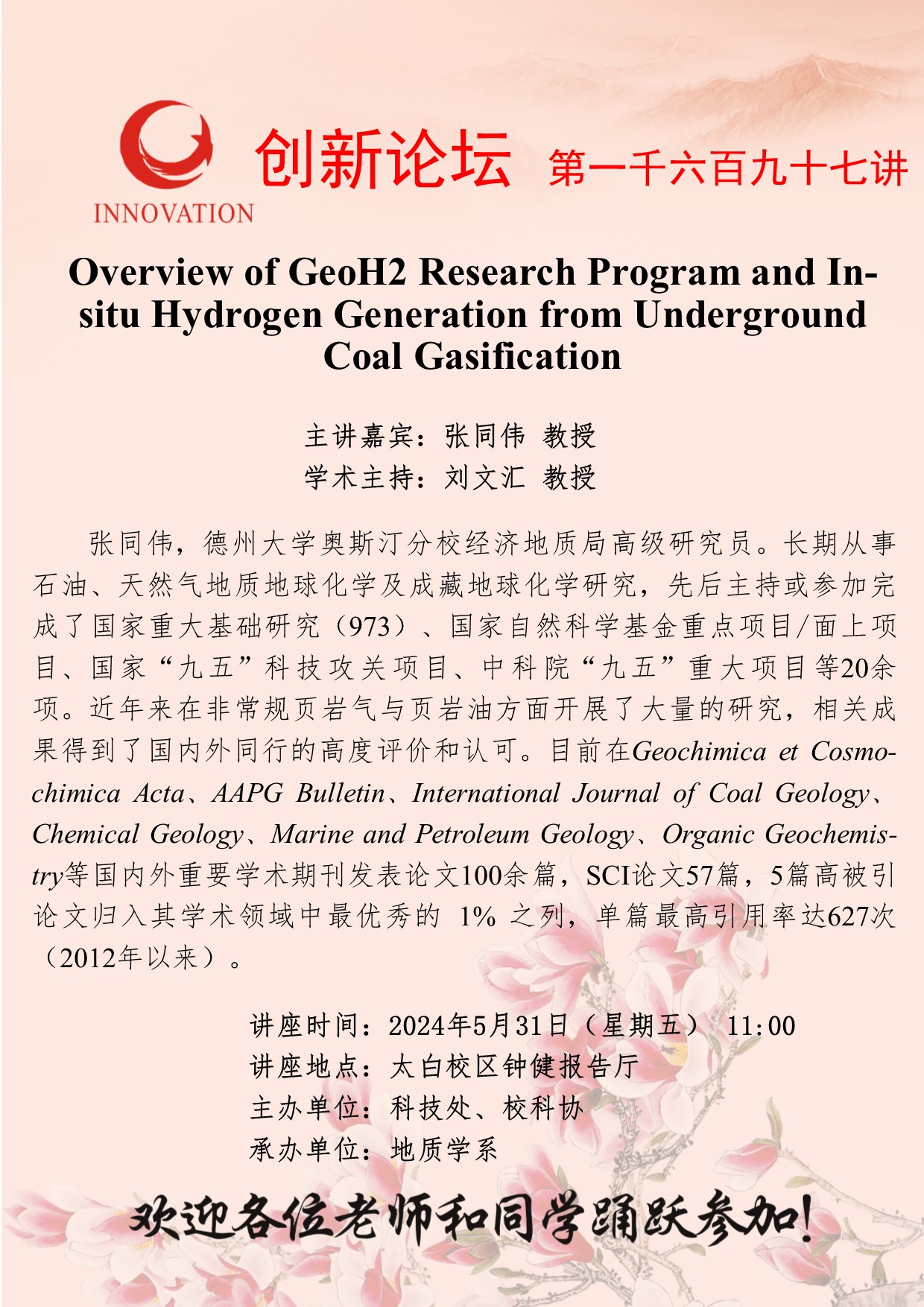 张同伟 教授 乐投平台创新论坛第一千六百九十七讲:Overview of GeoH2 Research Program and In-situ Hydrogen Generation from Underground Coal Gasification 讲座时间 2024年5月31日(星期五) 11:00 讲座地点 太白校区钟健报告厅 讲座人介绍 张同伟 教授 讲座内容