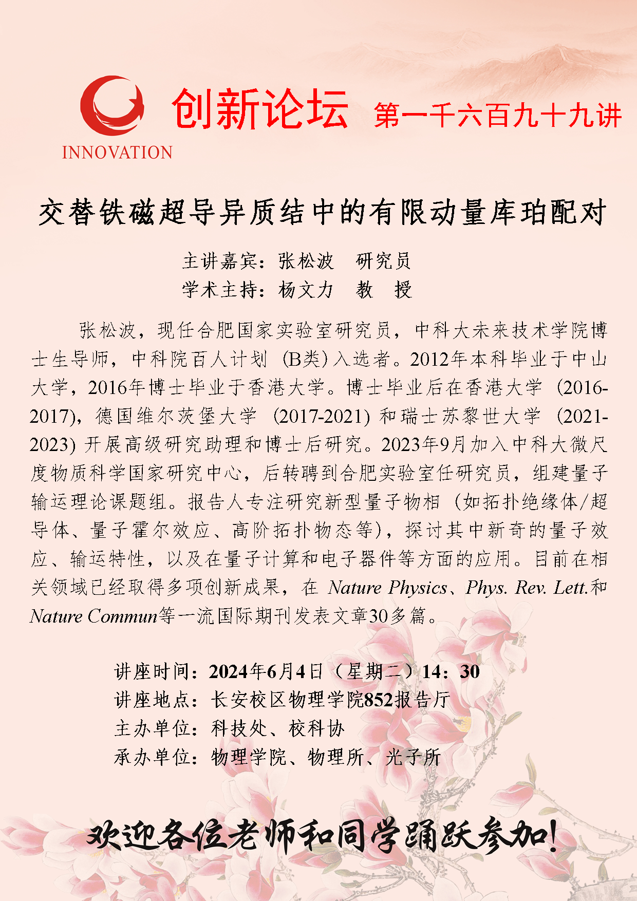 张松波 研究员 乐投平台创新论坛第一千六百九十九讲:交替铁磁超导异质结中的有限动量库珀配对 讲座时间 2024年6月4日(星期二)14:30 讲座地点 长安校区物理学院852报告厅 讲座人介绍 张松波 研究员 讲座内容