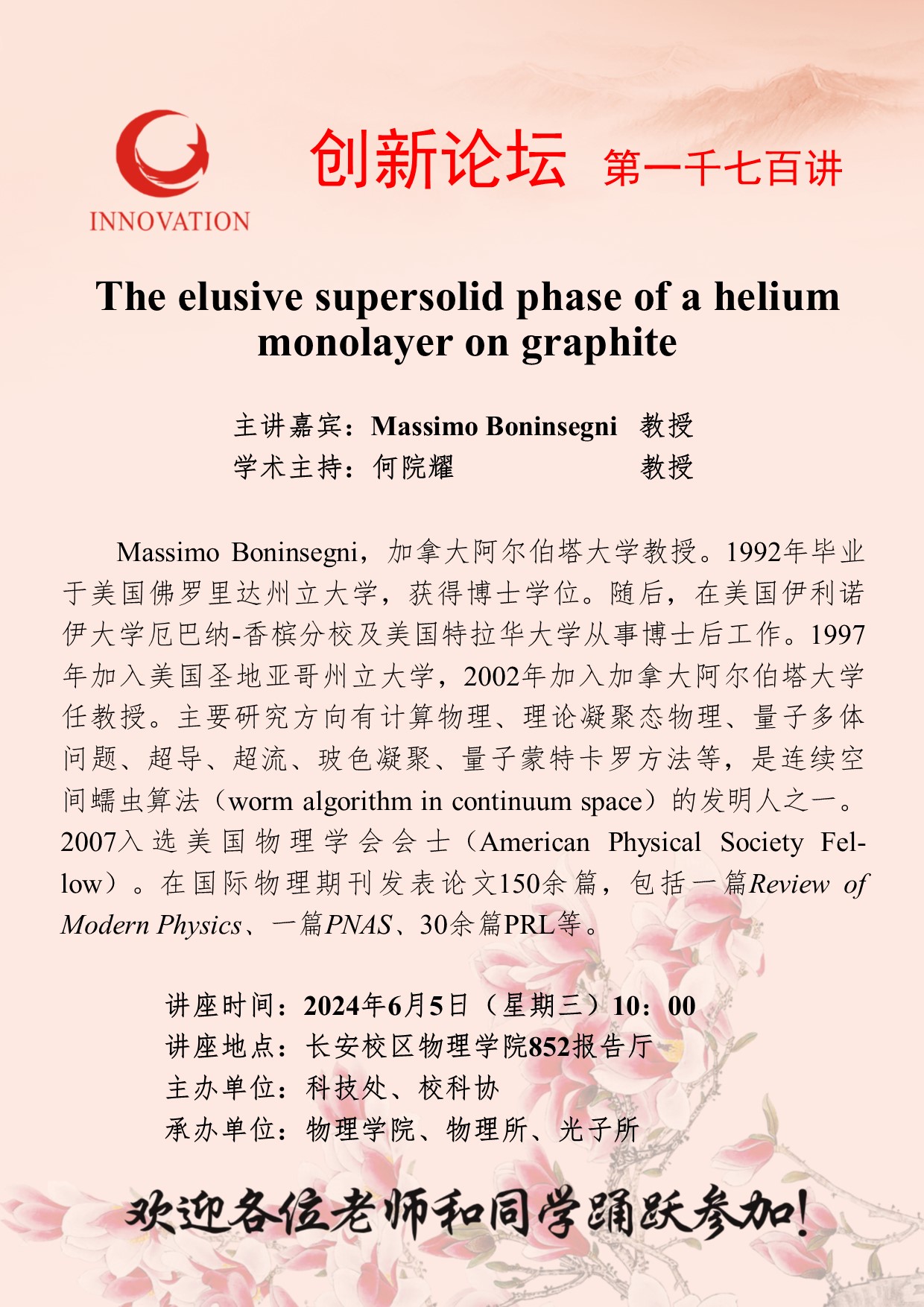 Massimo Boninsegni 教授 乐投平台创新论坛第一千七百讲:The elusive supersolid phase of a helium monolayer on graphite 讲座时间 2024年6月5日(星期三)10:00 讲座地点 长安校区物理学院852报告厅 讲座人介绍 Massimo Boninsegni 教授 讲座内容