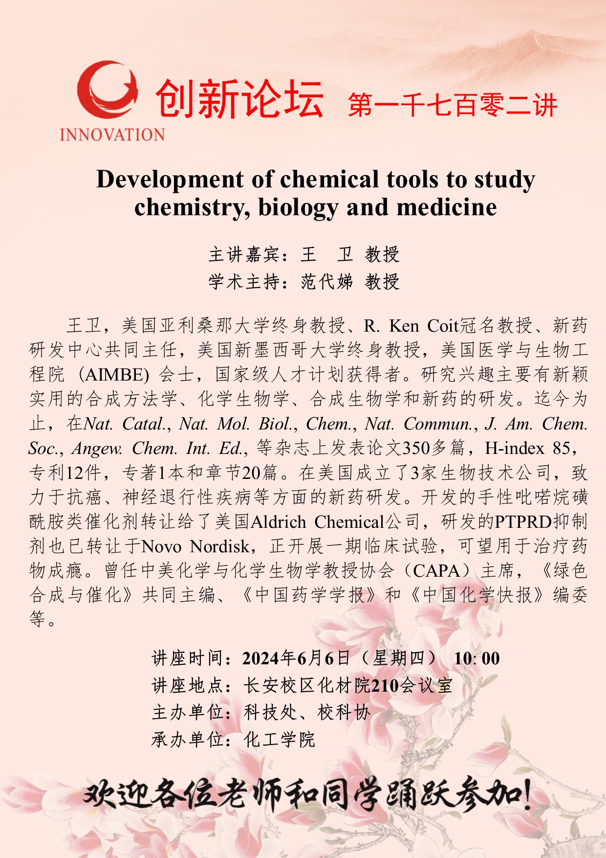 王卫 教授 乐投平台创新论坛第一千七百零二讲:Development of chemical tools to study chemistry, biology and medicine 讲座时间 2024年6月6日(星期四) 10: 00 讲座地点 长安校区化材院210会议室 讲座人介绍 王卫 教授 讲座内容