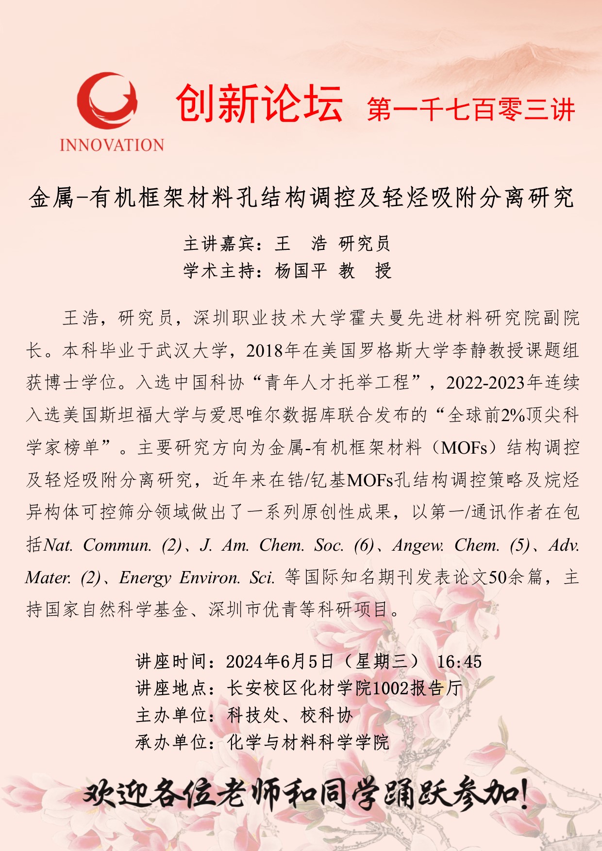 王浩 研究员 乐投平台创新论坛第一千七百零三讲:金属-有机框架材料孔结构调控及轻烃吸附分离研究 讲座时间 2024年6月5日(星期三) 16:45 讲座地点 长安校区化材学院1002报告厅 讲座人介绍 王浩 研究员 讲座内容