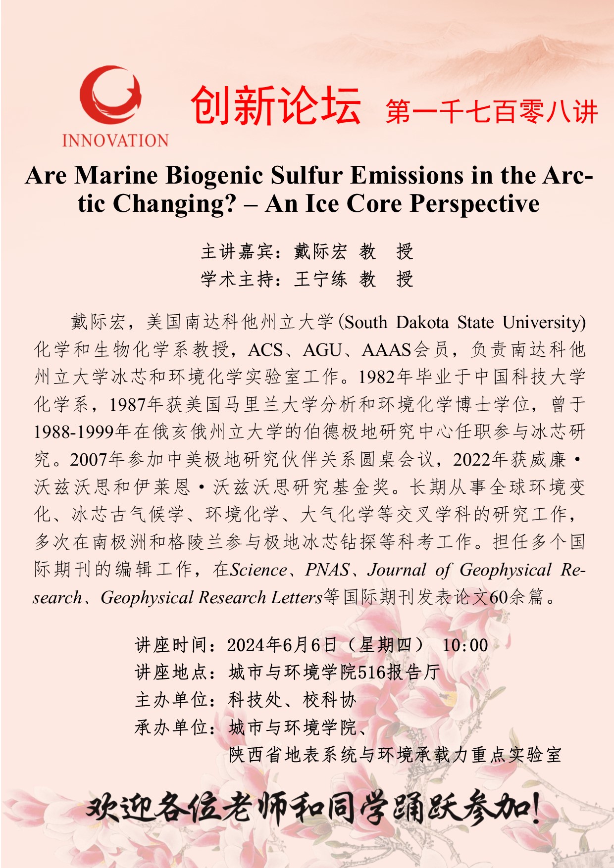 戴际宏 教授 乐投平台创新论坛第一千七百零八讲:Are Marine Biogenic Sulfur Emissions in the Arctic Changing? – An Ice Core Perspective 讲座时间 2024年6月6日(星期四) 10:00 讲座地点 城市与环境学院516报告厅 讲座人介绍 戴际宏 教授 讲座内容