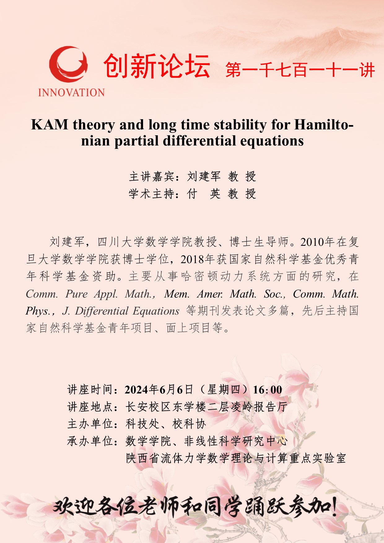 刘建军 教授 乐投平台创新论坛第一千七百一十一讲:KAM theory and long time stability for Hamiltonian partial differential equations 讲座时间 2024年6月6日(星期四)16:00 讲座地点 长安校区东学楼二层凌岭报告厅 讲座人介绍 刘建军 教授 讲座内容