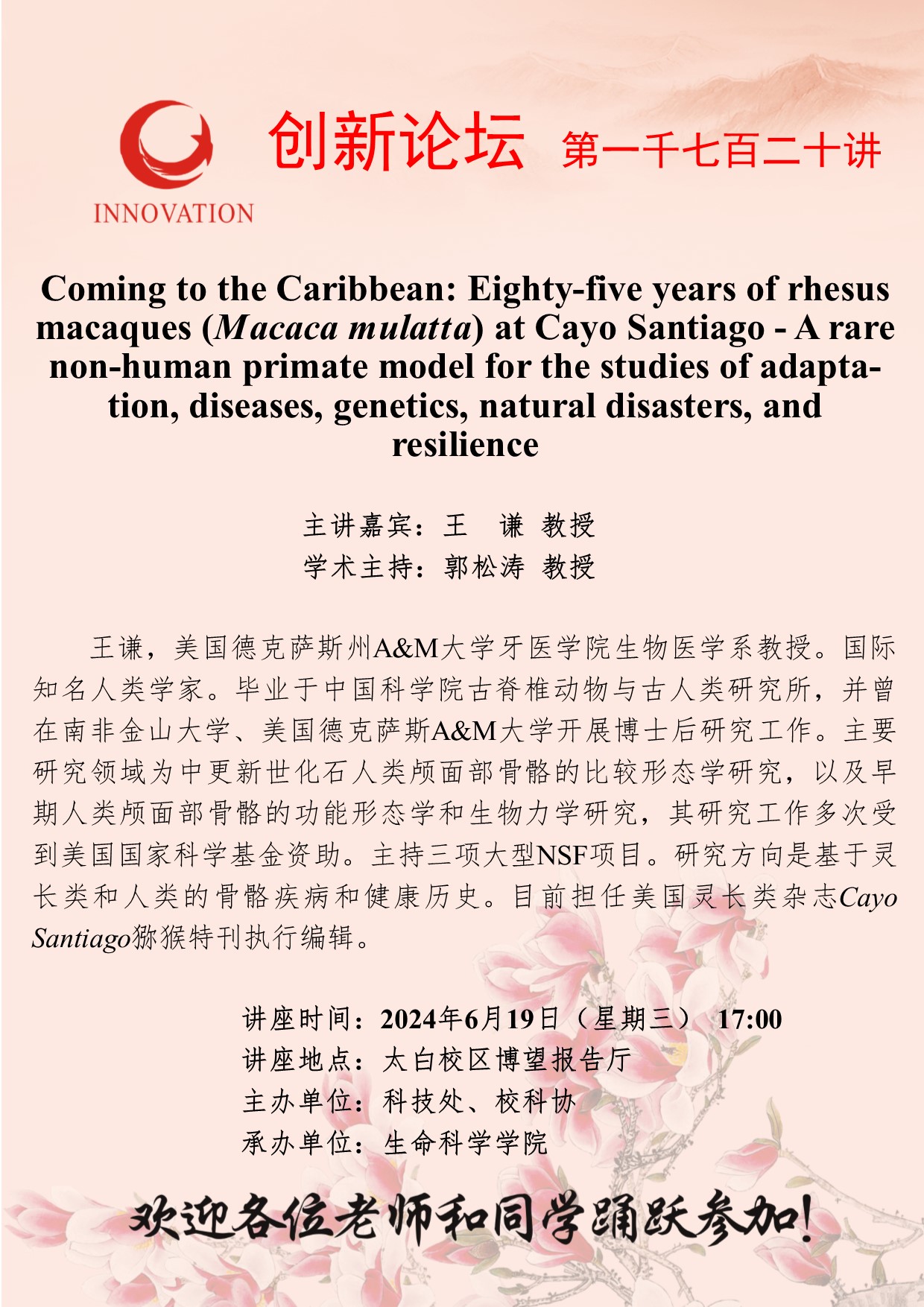王谦 教授 乐投平台创新论坛第一千七百二十讲:Coming to the Caribbean: Eighty-five years of rhesus macaques (Macaca mulatta) at Cayo Santiago - A rare non-human primate model for the studies of adaptation, diseases, genetics, natural disasters, and resilience 讲座时间 2024年6月19日(星期三) 17:00 讲座地点 太白校区博望报告厅 讲座人介绍 王谦 教授 讲座内容