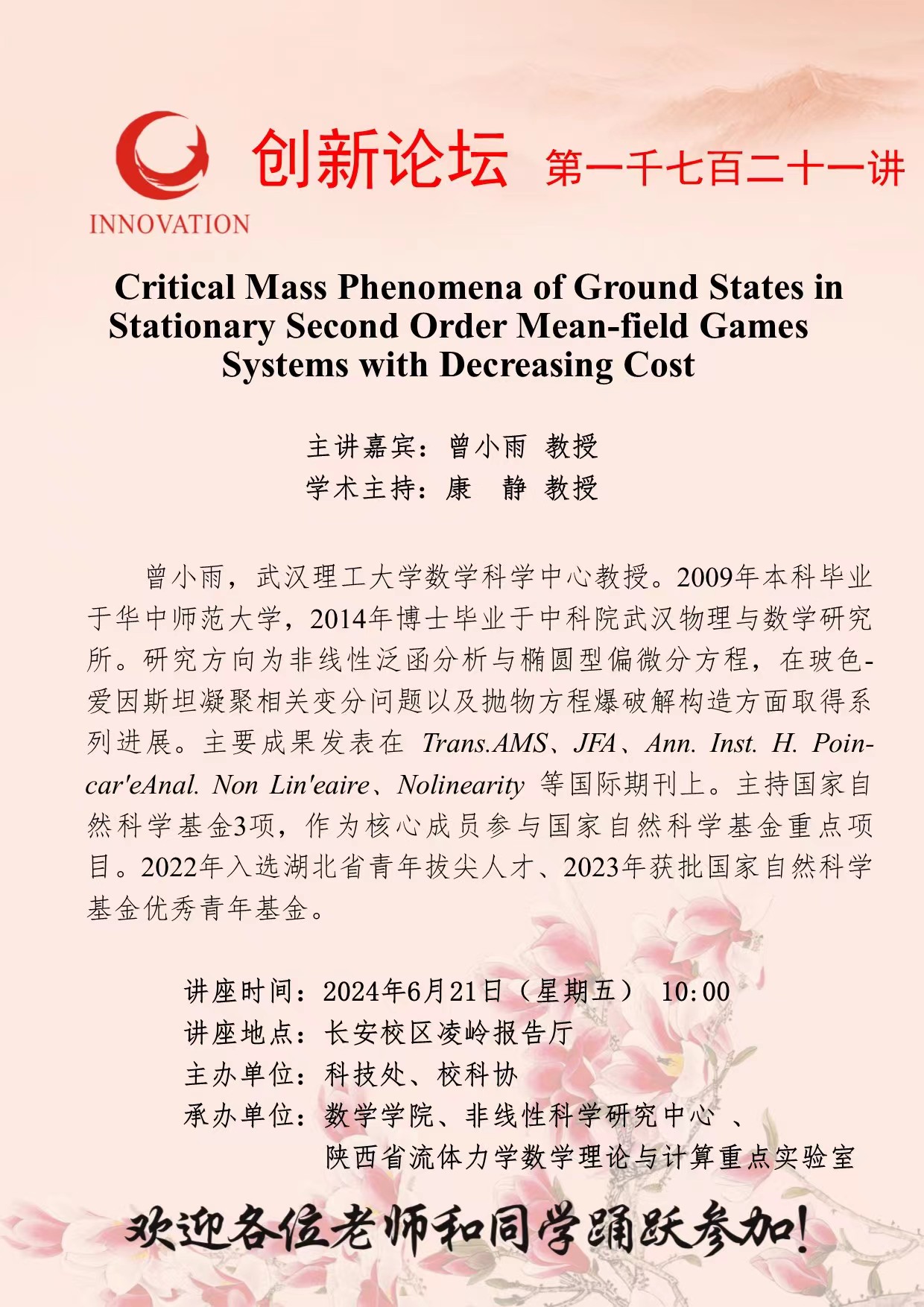 曾小雨 教授 乐投平台创新论坛第一千七百二十一讲: Critical Mass Phenomena of Ground States in Stationary Second Order Mean-field Games Systems with Decreasing Cost 讲座时间 2024年6月21日(星期五) 10:00 讲座地点 长安校区凌岭报告厅 讲座人介绍 曾小雨 教授 讲座内容