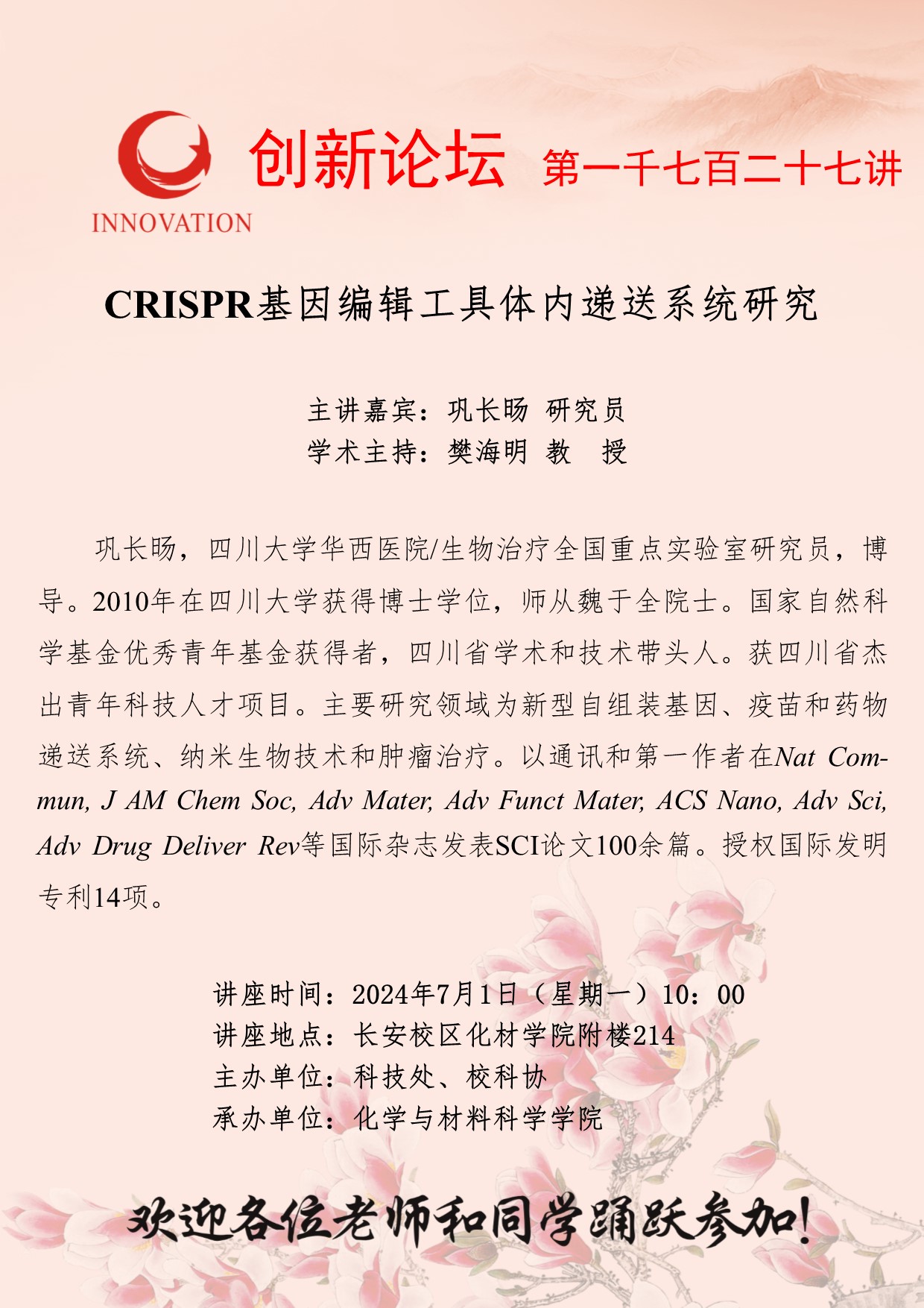 巩长旸 研究员 乐投平台创新论坛第一千七百二十七讲:CRISPR基因编辑工具体内递送系统研究 讲座时间 2024年7月1日(星期一)10:00 讲座地点 长安校区化材学院附楼214 讲座人介绍 巩长旸 研究员 讲座内容