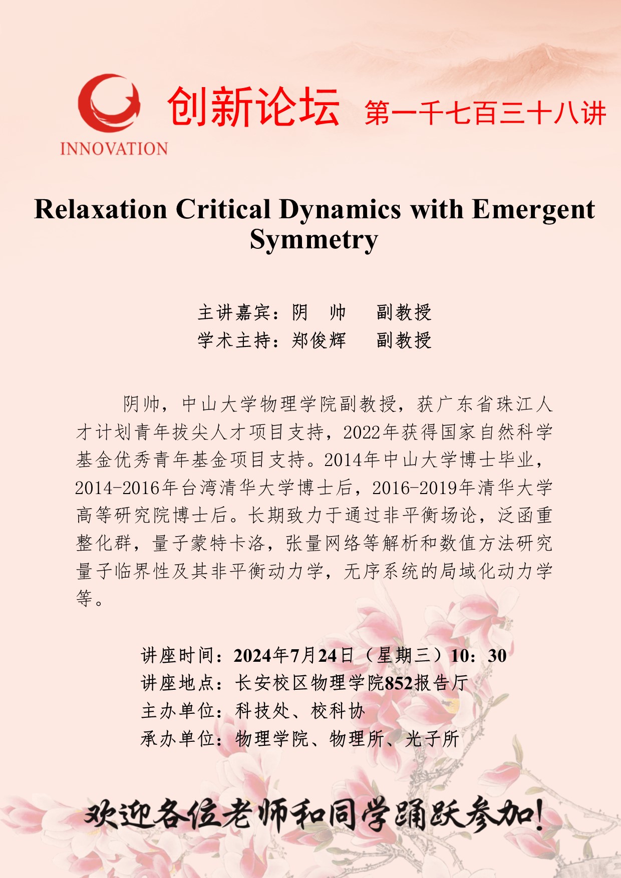 阴帅 副教授 乐投平台创新论坛第一千七百三十八讲:Relaxation Critical Dynamics with Emergent Symmetry 讲座时间 2024年7月24日(星期三)10:30 讲座地点 长安校区物理学院852报告厅 讲座人介绍 阴帅 副教授 讲座内容