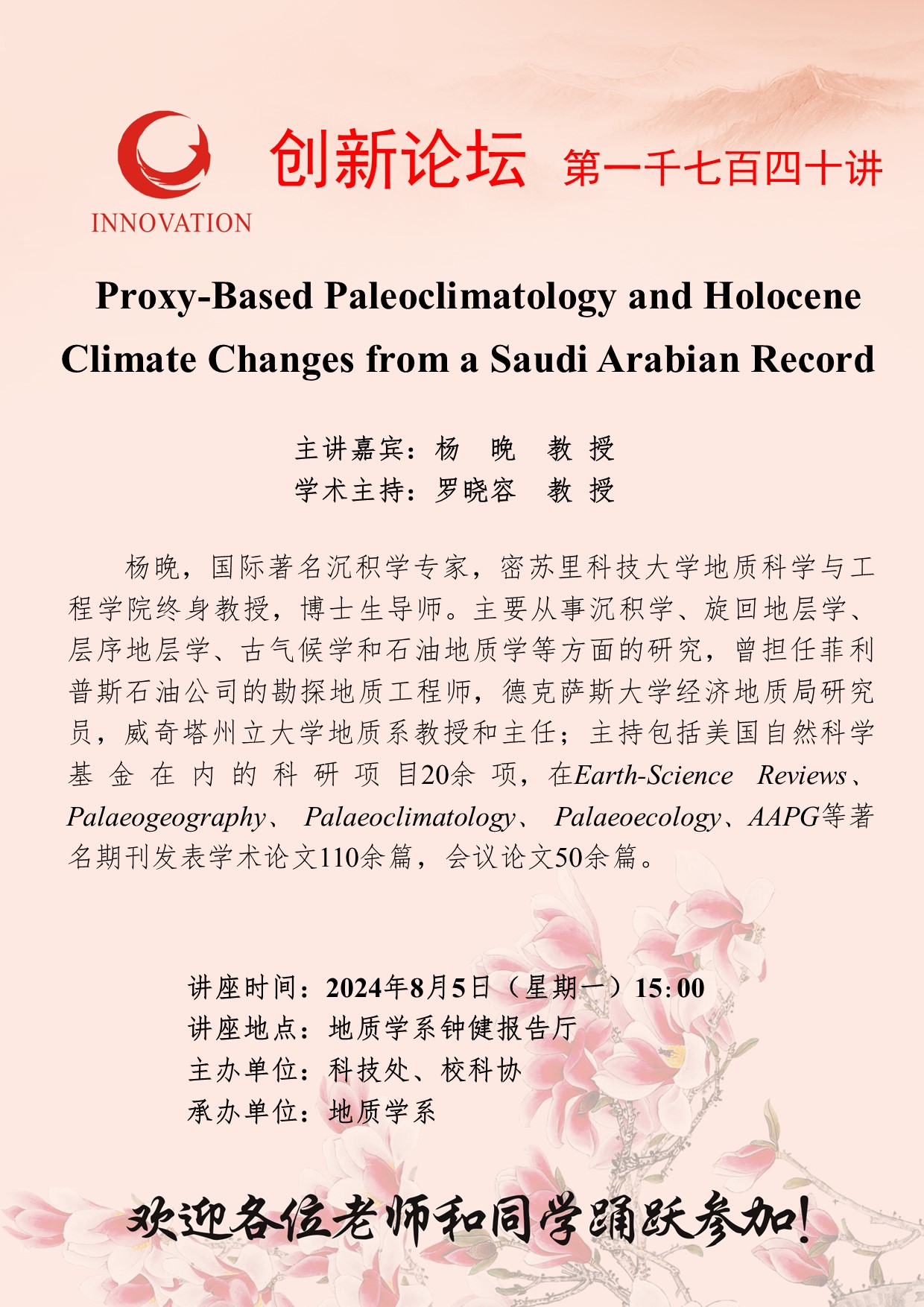 杨晚 教授 乐投平台创新论坛第一千七百四十讲: Proxy-Based Paleoclimatology and Holocene Climate Changes from a Saudi Arabian Record 讲座时间 2024年8月5日(星期一)15:00 讲座地点 地质学系钟健报告厅 讲座人介绍 杨晚 教授 讲座内容