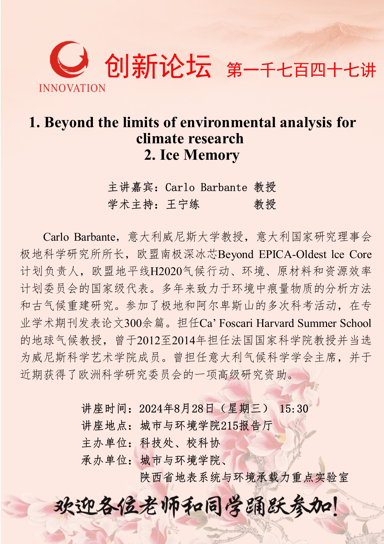 Carlo Barbante 教授 乐投平台创新论坛第一千七百四十七讲:1. Beyond the limits of environmental analysis for climate research 2. Ice Memory 讲座时间 2024年8月28日(星期三) 15:30 讲座地点 城市与环境学院215报告厅 讲座人介绍 Carlo Barbante 教授 讲座内容