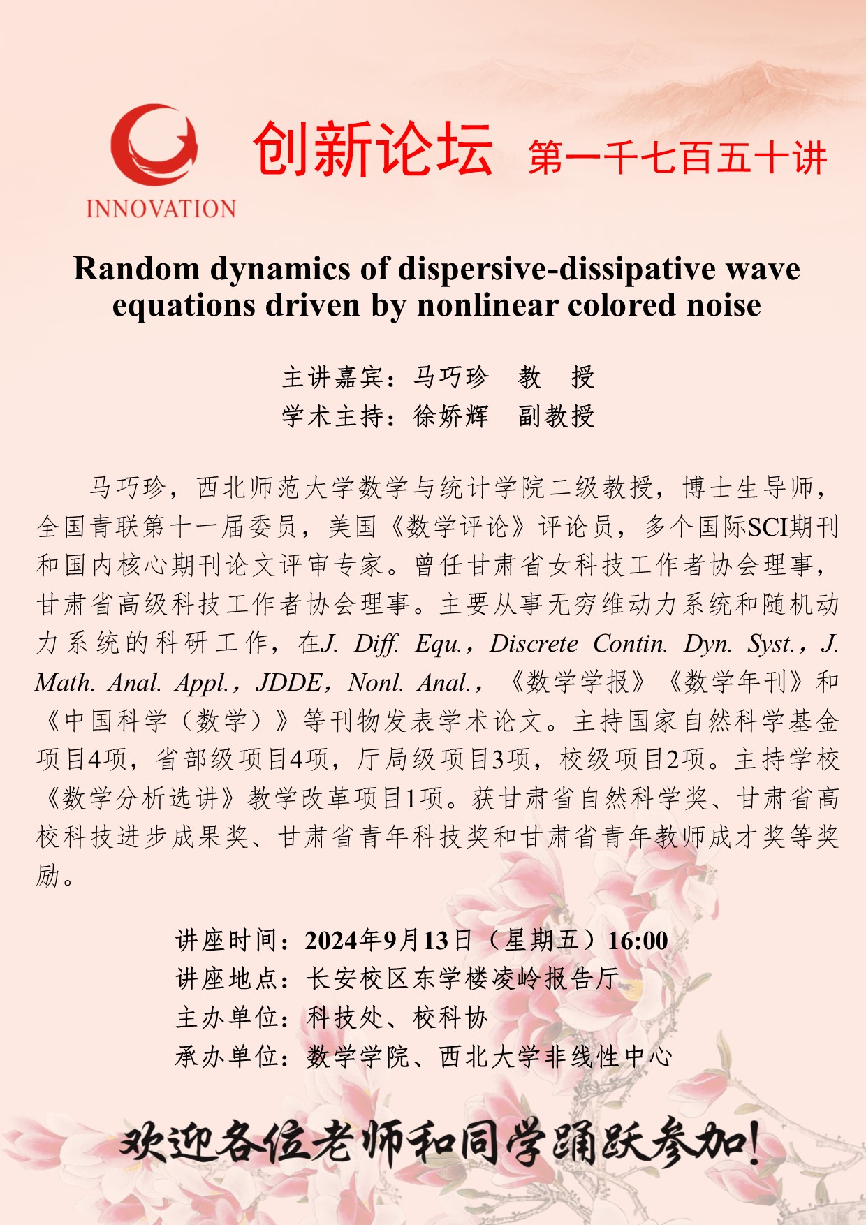 马巧珍 教授 乐投平台创新论坛第一千七百五十讲:Random dynamics of dispersive-dissipative wave equations driven by nonlinear colored noise 讲座时间 2024年9月13日(星期五)16:00 讲座地点 长安校区东学楼凌岭报告厅 讲座人介绍 马巧珍 教授 讲座内容