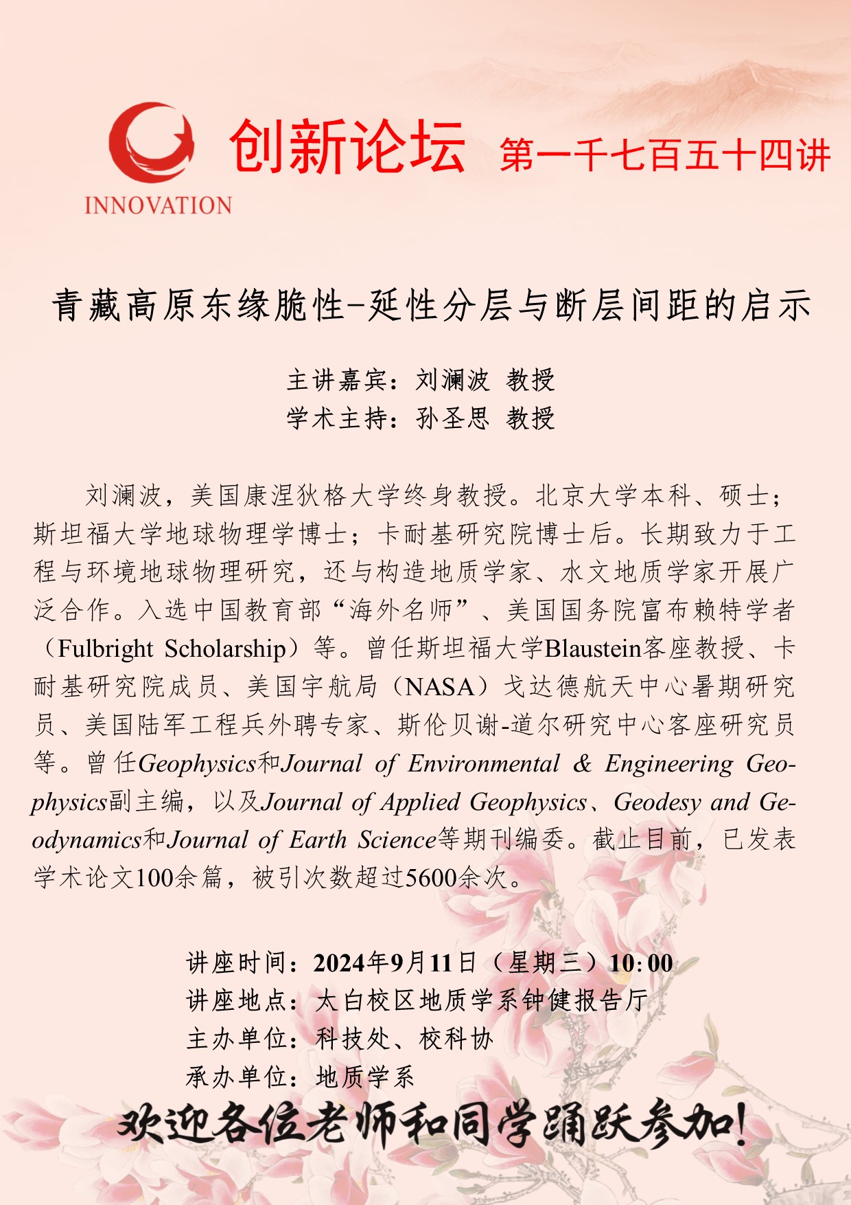 刘澜波 教授 乐投平台创新论坛第一千七百五十四讲:青藏高原东缘脆性-延性分层与断层间距的启示 讲座时间 2024年9月11日(星期三)10:00 讲座地点 太白校区地质学系钟健报告厅 讲座人介绍 刘澜波 教授 讲座内容