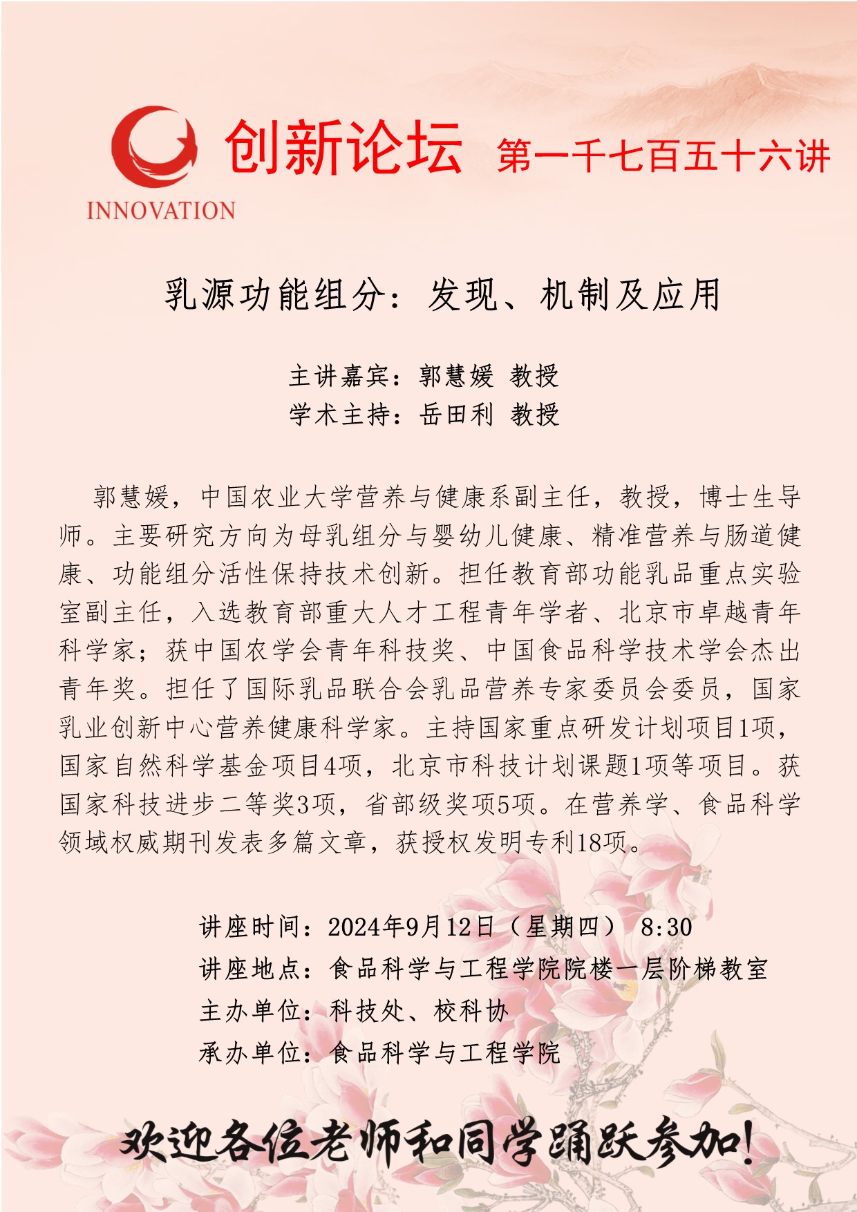 郭慧媛 教授 乐投平台创新论坛第一千七百五十六讲: 乳源功能组分: 发现、机制及应用 讲座时间 2024年9月12日(星期四) 8:30 讲座地点 食品科学与工程学院院楼一层阶梯教室 讲座人介绍 郭慧媛 教授 讲座内容