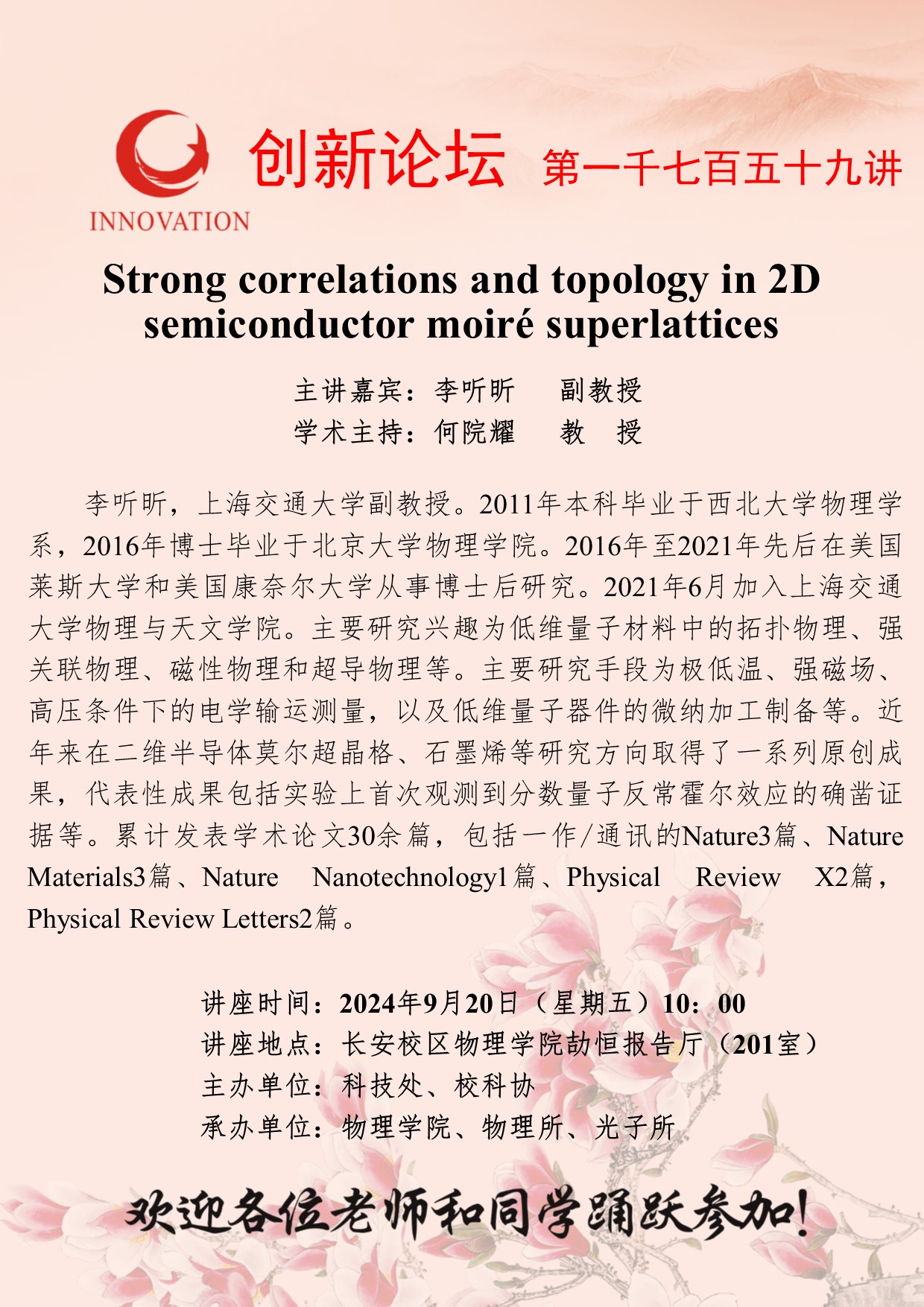 李听昕 副教授 乐投平台创新论坛第一千七百五十九讲:Strong correlations and topology in 2D semiconductor moiré superlattices 讲座时间 2024年9月20日(星期五) 10:00 讲座地点 长安校区物理学院劼恒报告厅(201室) 讲座人介绍 李听昕 副教授 讲座内容
