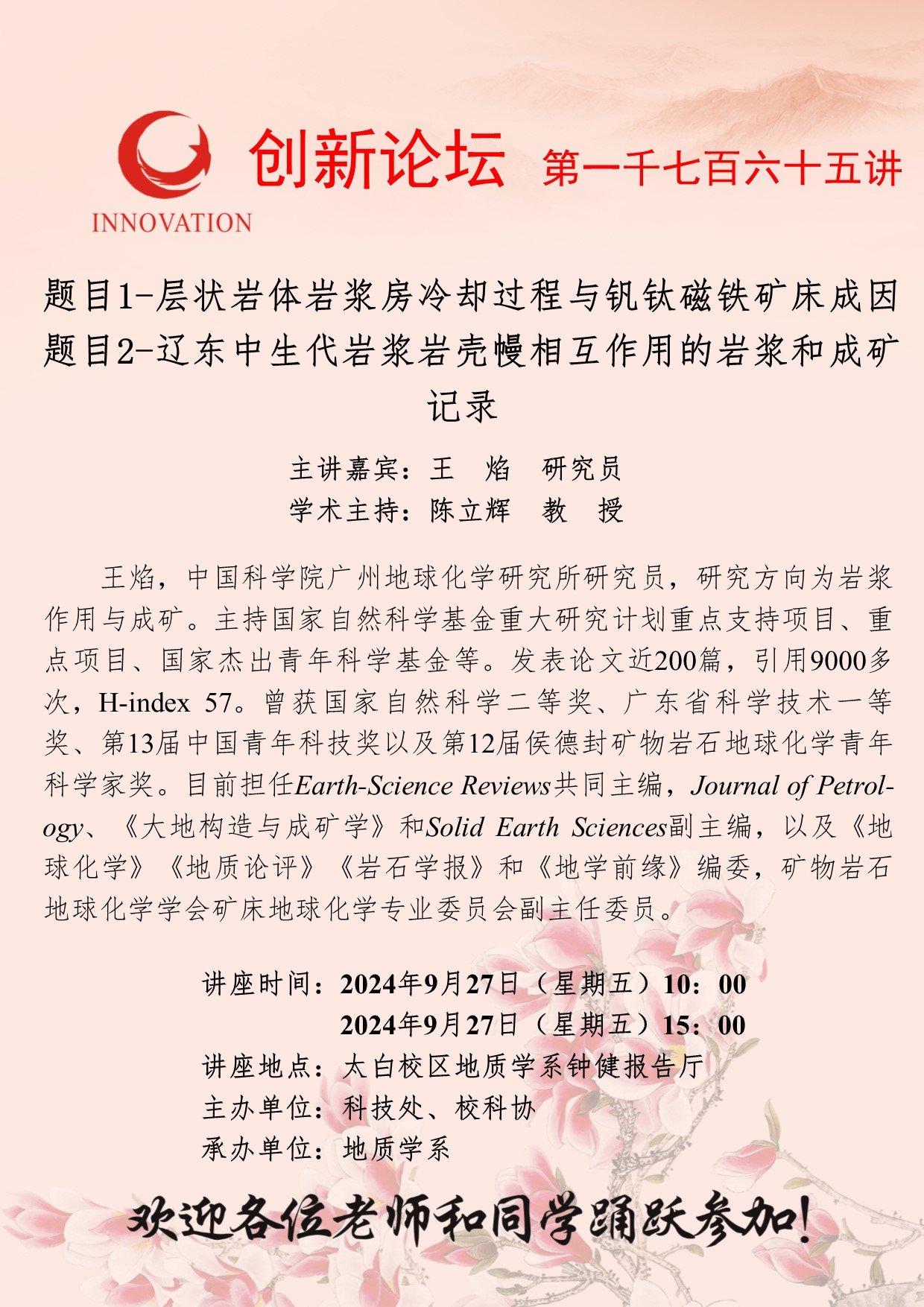 王焰 研究员 乐投平台创新论坛第一千七百六十五讲:题目1-层状岩体岩浆房冷却过程与钒钛磁铁矿床成因 题目2-辽东中生代岩浆岩壳幔相互作用的岩浆和成矿记录 讲座时间 2024年9月27日(星期五)10:00 2024年9月27日(星期五)15:00 讲座地点 太白校区地质学系钟健报告厅 讲座人介绍 王焰 研究员 讲座内容