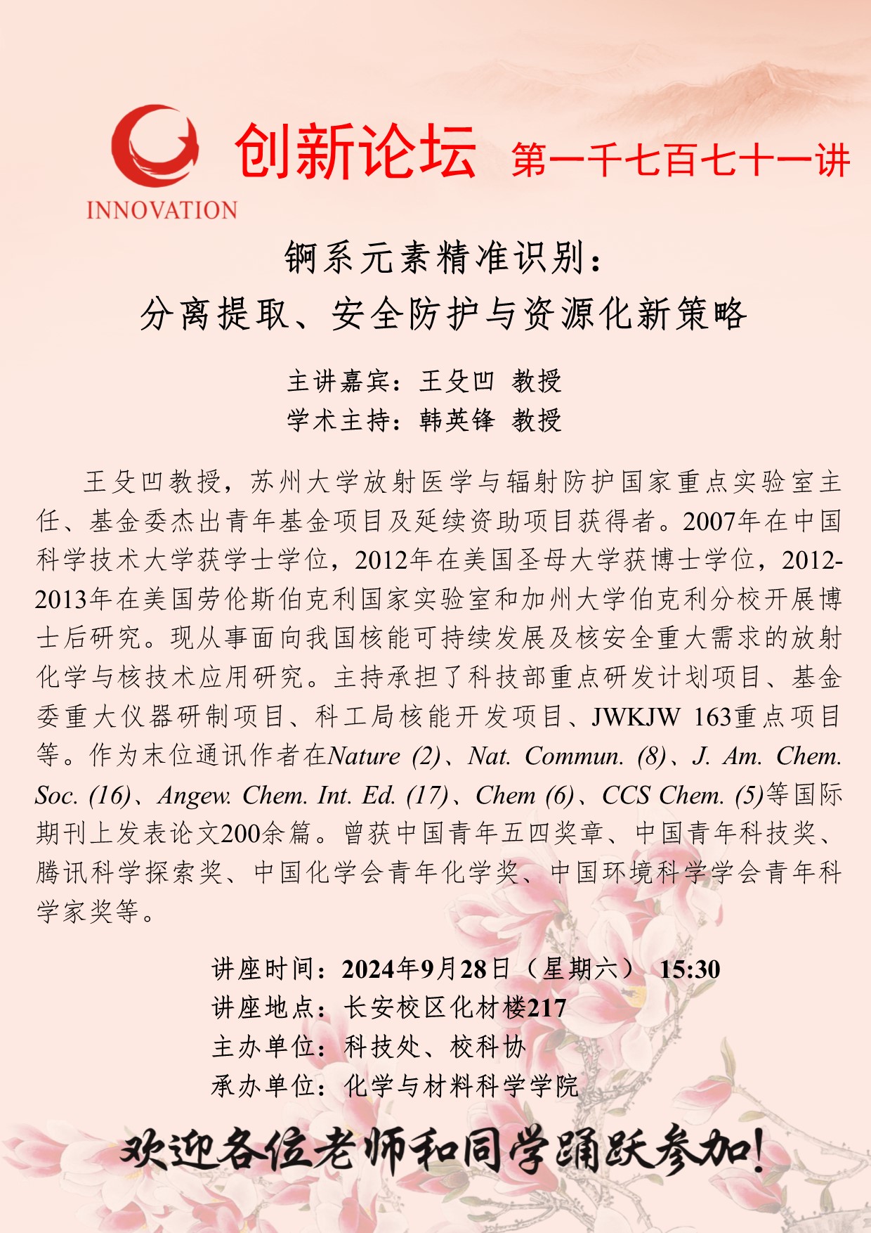 王殳凹 教授 乐投平台创新论坛第一千七百七十一讲:锕系元素精准识别:分离提取、安全防护与资源化新策略 讲座时间 2024年9月28日(星期六) 15:30 讲座地点 长安校区化材楼217 讲座人介绍 王殳凹 教授 讲座内容