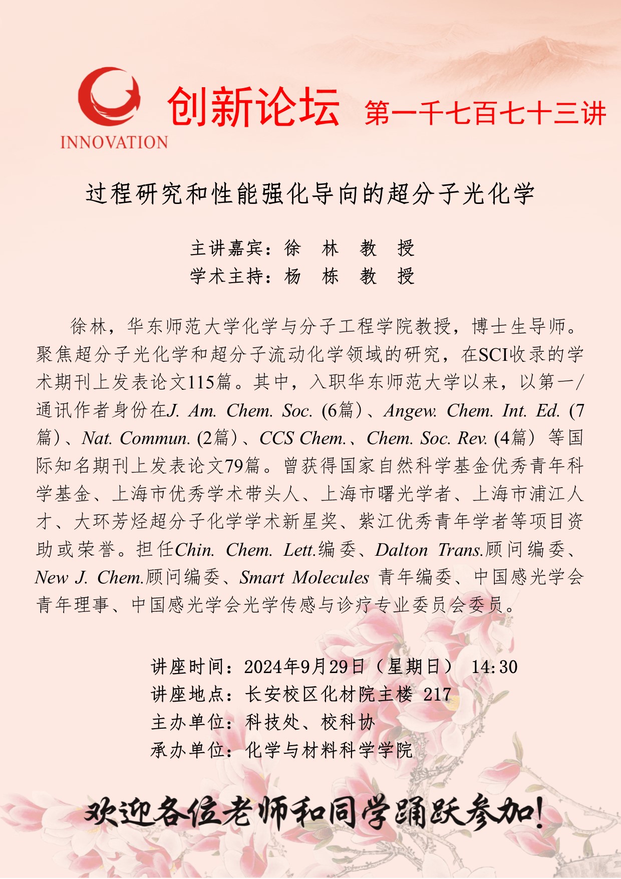 徐林 教授 乐投平台创新论坛第一千七百七十三讲:过程研究和性能强化导向的超分子光化学 讲座时间 2024年9月29日(星期日) 14:30 讲座地点 长安校区化材院主楼 217 讲座人介绍 徐林 教授 讲座内容