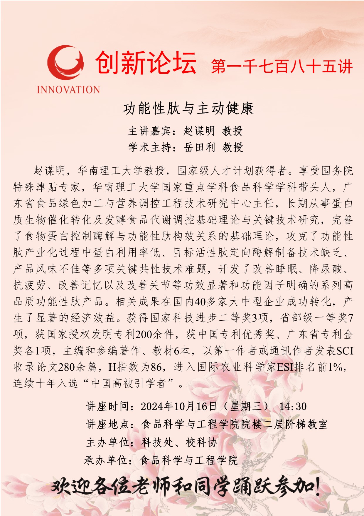 赵谋明 教授 乐投平台创新论坛第一千七百八十五讲:功能性肽与主动健康 讲座时间 2024年10月16日(星期三) 14:30 讲座地点 食品科学与工程学院院楼二层阶梯教室 讲座人介绍 赵谋明 教授 讲座内容
